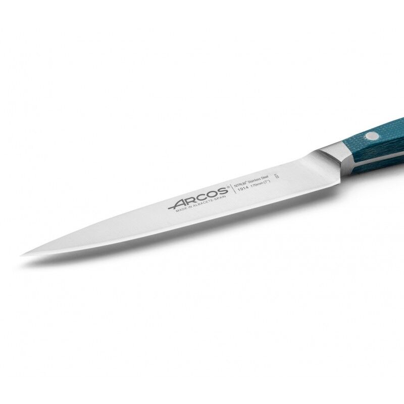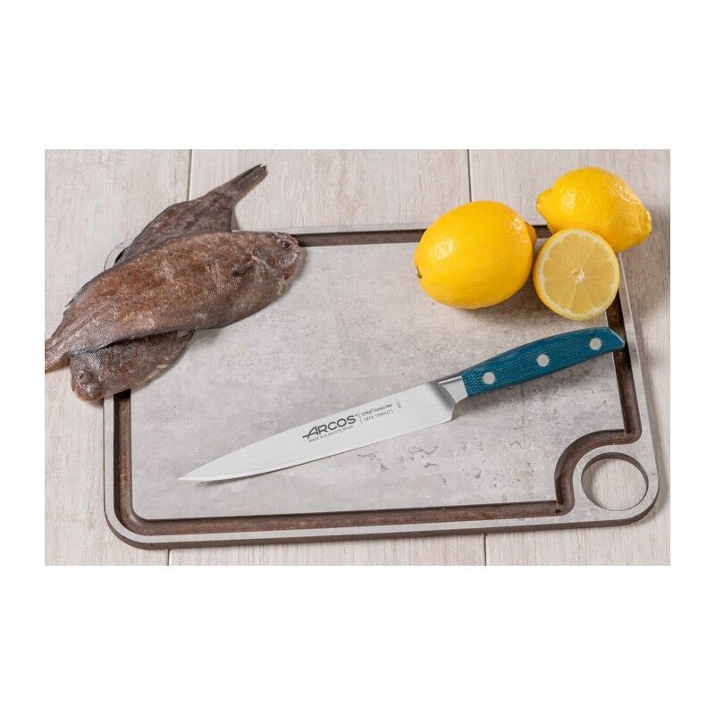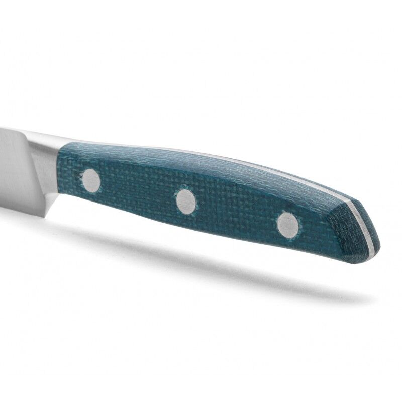 Esta faca destaca-se pela sua lâmina longa, flexível, de gume liso e forte. Tem uma lâmina forjada de 170 mm em aço inoxidável NITRUM®. Este tipo de aço melhora o desempenho das facas graças à sua fórmula exclusiva de aço azotado, que lhe confere uma elevada dureza, uma grande capacidade de corte e resistência à oxidação. Uma das qualidades mais marcantes desta série é o seu gume de seda exclusivo, no qual todo o nosso saber-fazer se concentrou para obter um corte preciso e inigualável. Para o cabo, utilizámos um material Micarta feito de tecido prensado em resina com tramas em tons de azul. Este material confere às nossas facas uma maior dureza e resistência a temperaturas extremas. Possui uma meia virola, que facilita o corte e a afiação. Fabricada com rebites de lingueta e ranhura em aço inoxidável para garantir uma elevada resistência à corrosão. A espinha arredondada e polida da lâmina confere à faca uma aderência suave.