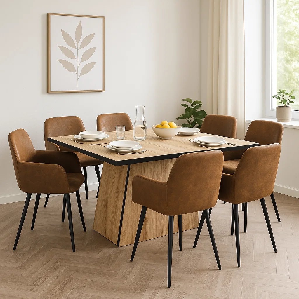 As seis cadeiras que acompanham o conjunto são estofadas em tecido castanho suave de estilo retro, oferecendo uma sensação quente e agradável ao toque. Com assento amplo, encosto ergonómico e práticos apoios de braços, proporcionam conforto mesmo durante refeições prolongadas. A estrutura em metal preto acrescenta um contraste elegante e assegura resistência e estabilidade, enquanto as pontas com proteção evitam riscos no piso.
