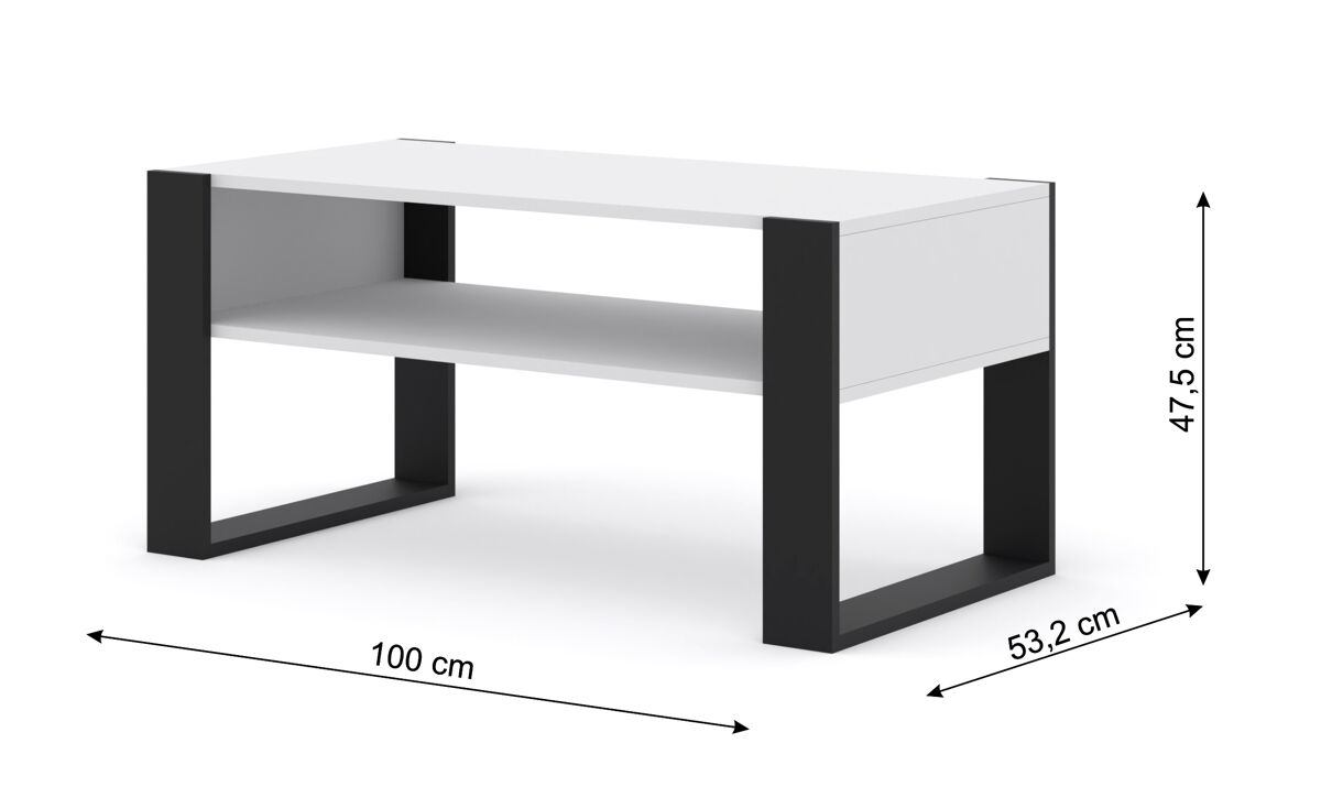 Mesa de café extremamente moderna e prática para a sala de estar. É caracterizada por uma aparência moderna e agradável - seu charme é determinado por grandes pernas pretas na forma de uma estrutura, que contrasta lindamente com o restante dos móveis. A tabela tem uma prateleira adicional.
