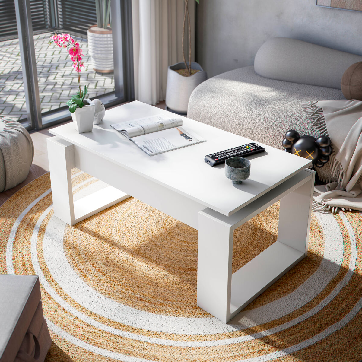 Descubra a mesa de centro elevável NOVA, em branco, ideal para aliar estilo e funcionalidade. Fabricada em melamina de 22 e 15 mm, apresenta uma estrutura robusta, ferramentas metálicas de fácil utilização e uma gaveta com espaço de arrumação oculto. As suas medidas são 150 cm de largura, 45 cm de altura quando fechada e 54 cm de altura, quando aberta, com uma profundidade de 55 cm. Inclui pernas anti-riscos e anti-ruído. Perfeita para espaços modernos e práticos. Dê um toque elegante à sua sala de estar!