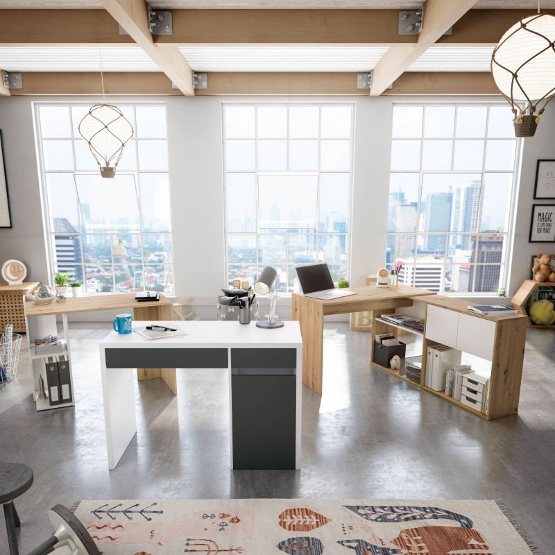 A secretária Kenia é uma mesa com um design original que se destaca pelo seu módulo de prateleiras contrastantes, que é reversível e pode ser colocado à direita ou à esquerda, consoante as suas necessidades.