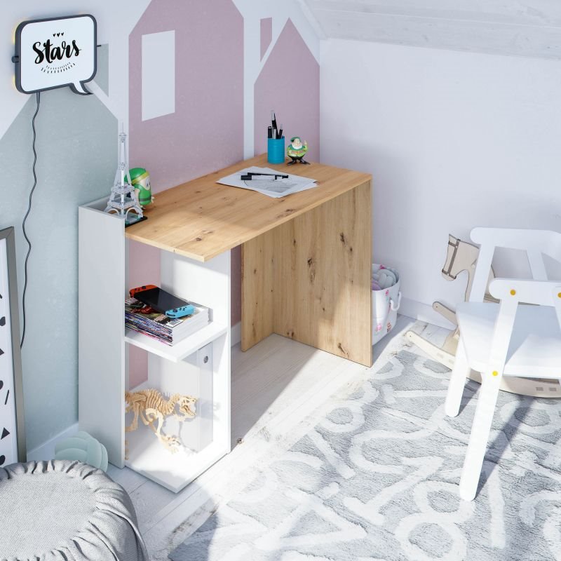 É uma mesa de 100 cm (largura) x 52 cm (profundidade) de superfície útil para trabalhar, onde uma pessoa pode trabalhar ou estudar confortavelmente. Também poderá guardar tudo o que não quiser na mesa. Inclui uma parte traseira vertical parcial em melamina, que dará maior estabilidade e resistência ao conjunto. Pode suportar um peso máximo de 25 kg no total e 3 kg para a prateleira.