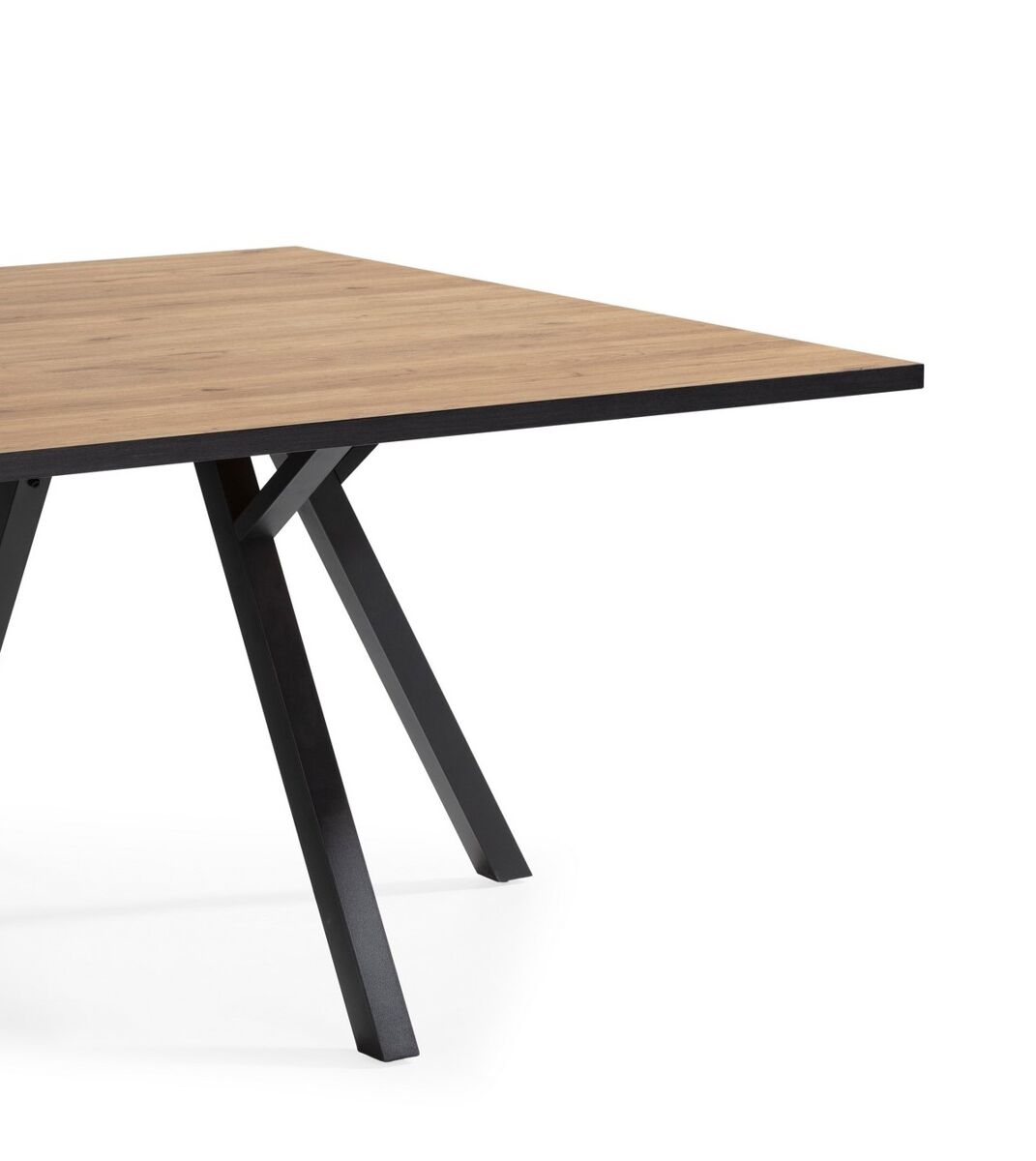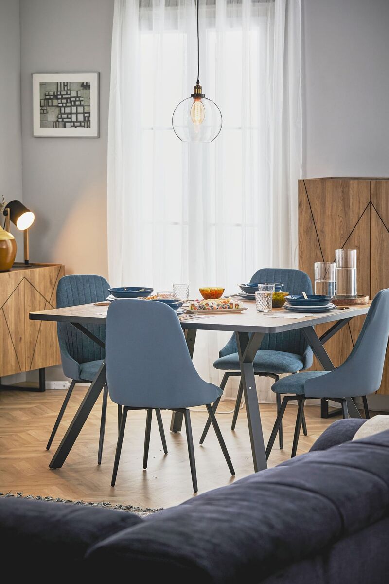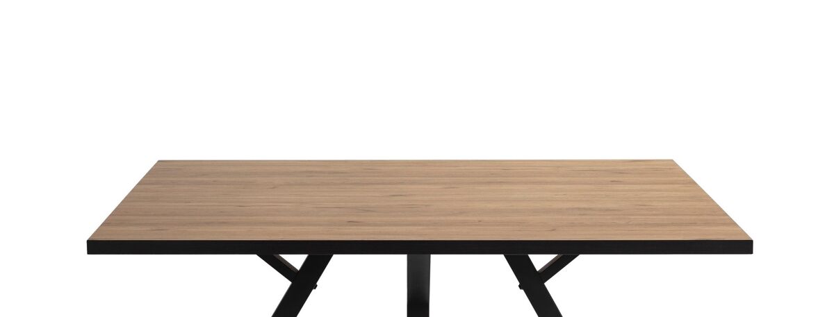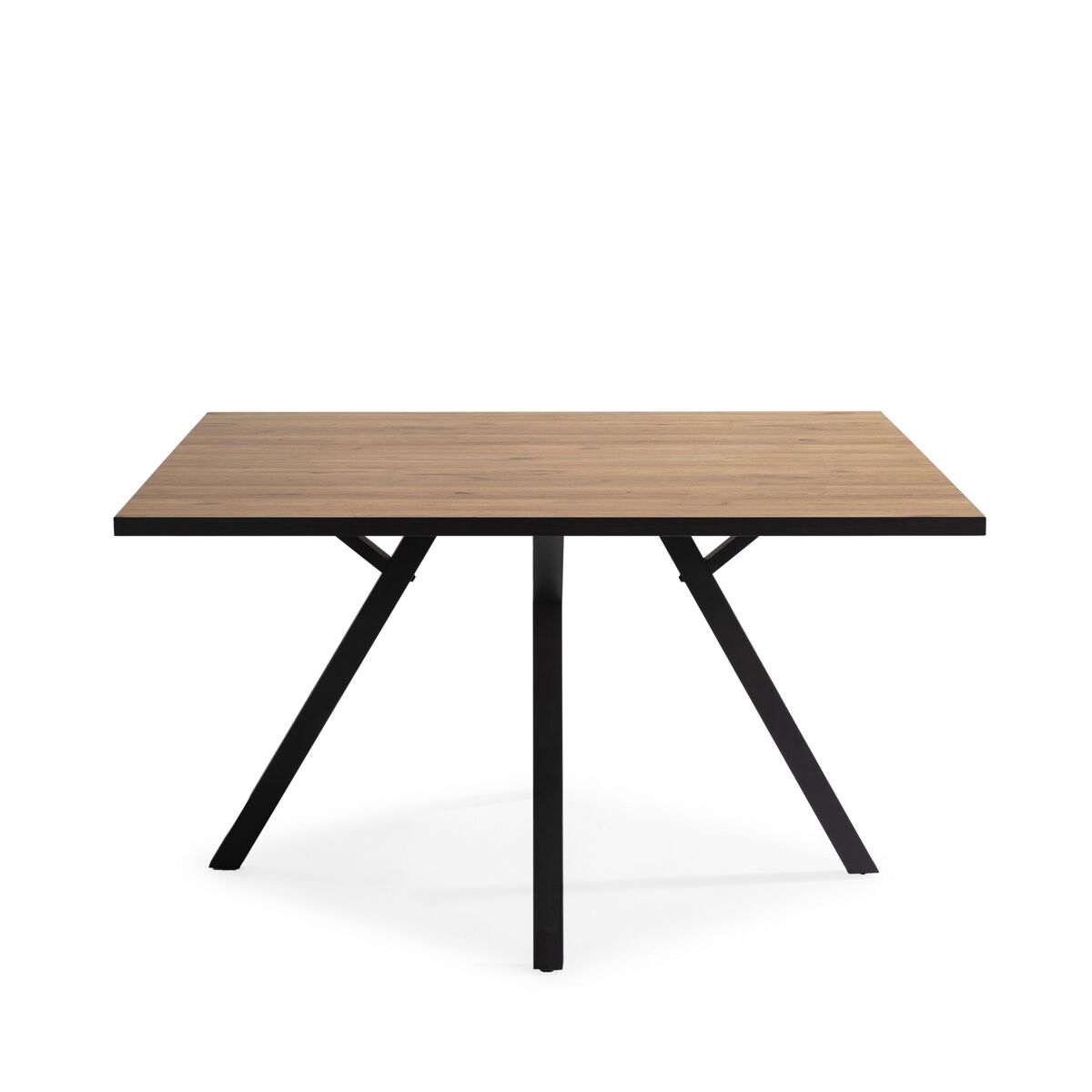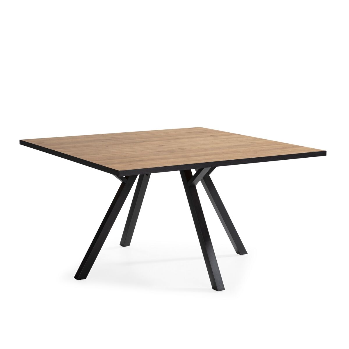 Apresentamos a Mesa de Jantar Milena. É uma mesa quadrada de 136X136 cm com uma estética vanguardista, que combina as linhas limpas do design moderno com o charme rústico. Tem um tampo resistente e elegante na cor carvalho, com pernas em preto na diagonal. Adapta-se bem a todos os tipos de decoração. Com um design marcante, esta mesa acrescenta um elemento de estilo e sofisticação a qualquer casa.