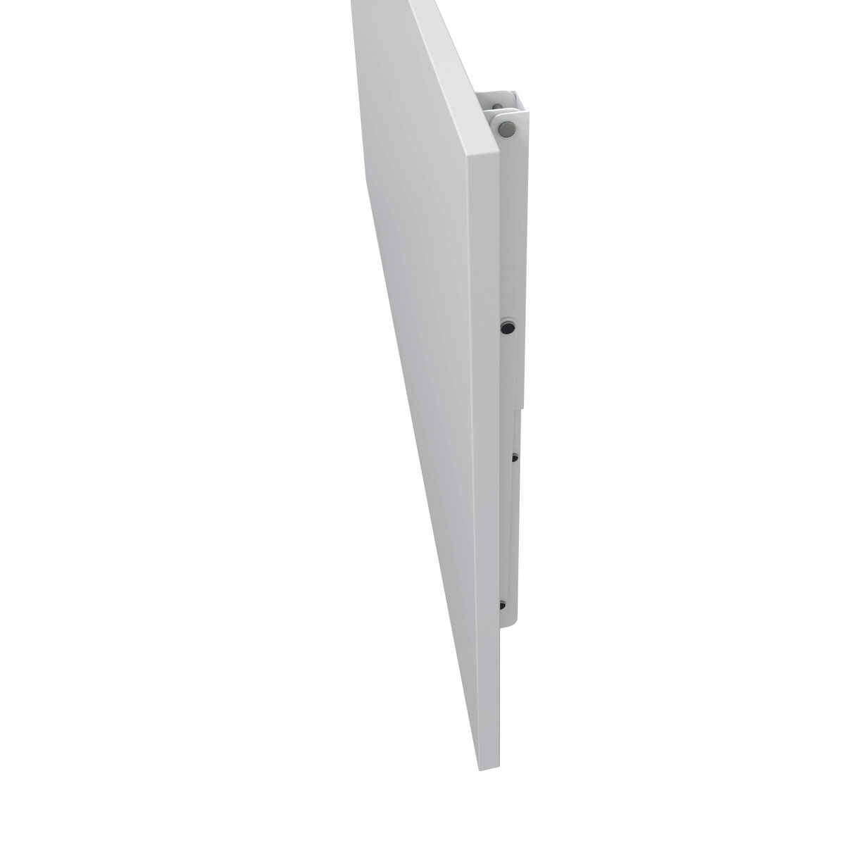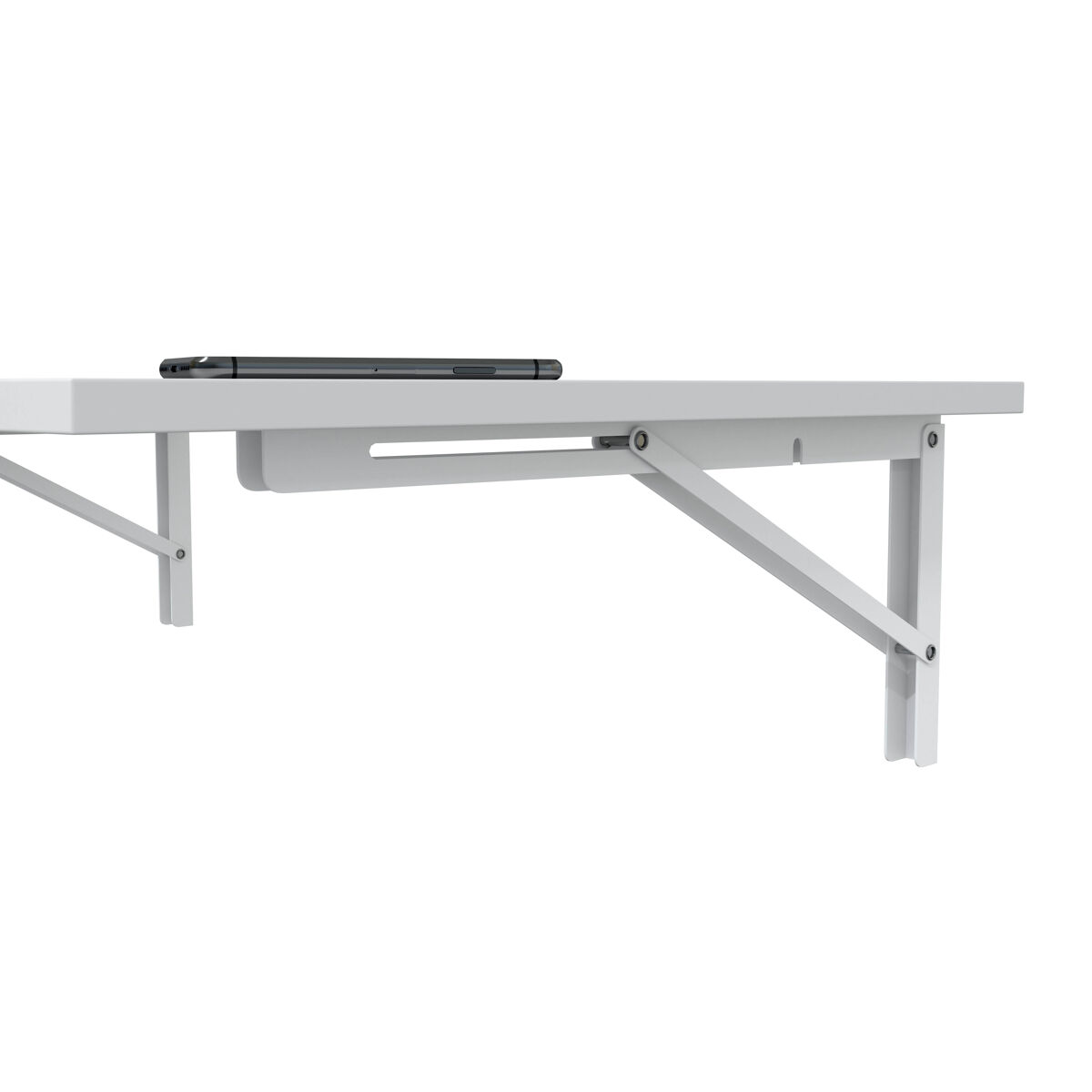 Mesa mural dobrável, suporte de aço pintado com botões que permitem dobrá-la e ativar o mecanismo de bloqueio que evita que os esquadros se dobrem acidentalmente.