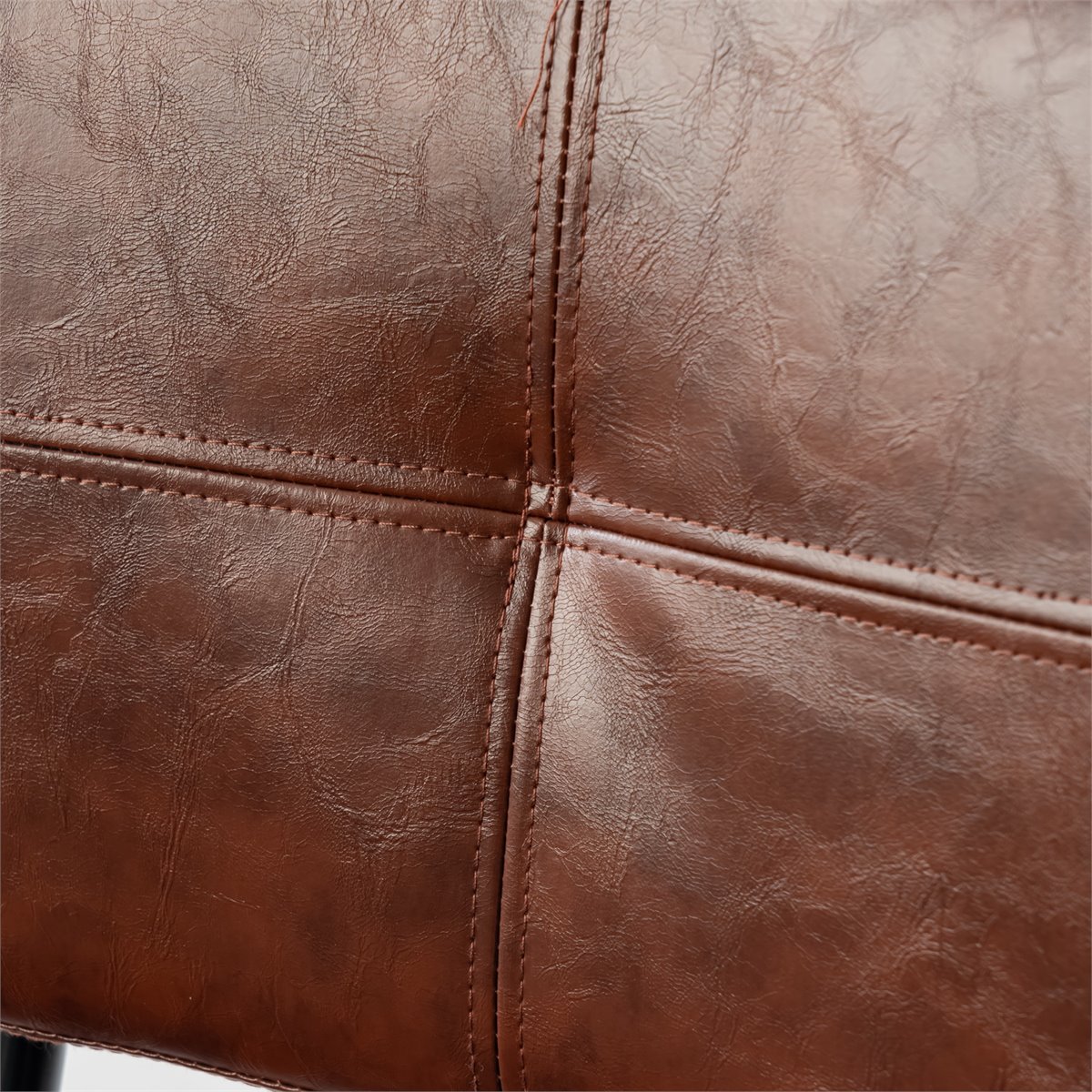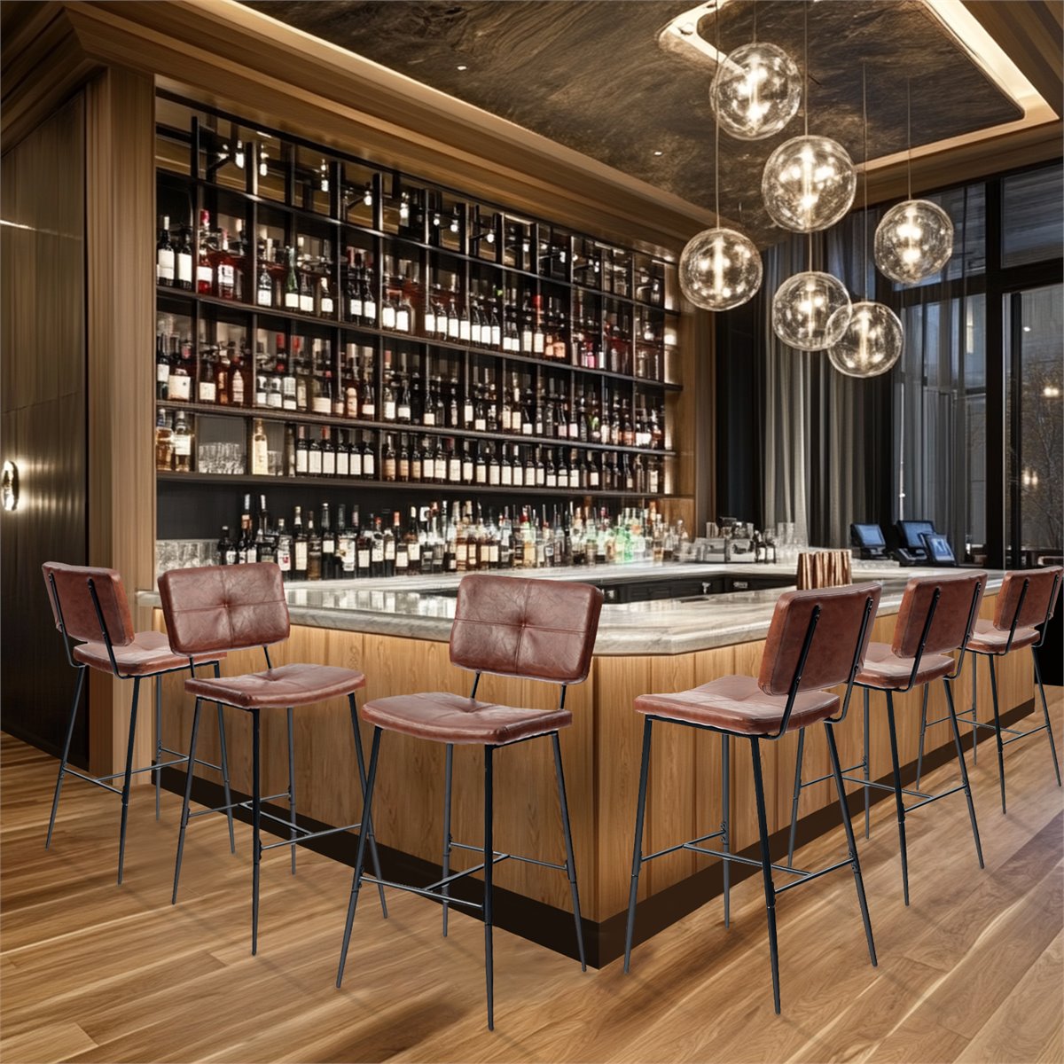 Jogo com 6 banquetas altas de assento e encosto acolchoados em couro sintético estilo vintage, de toque agradável e fácil de limpar. A estrutura metálica preta com apoio para os pés garante firmeza, e as sapatas antiderrapantes ajudam a proteger o piso. Perfeitas para cozinha e sala de jantar em casa e também para balcão de bar ou cafeteria, unindo conforto e design industrial moderno.