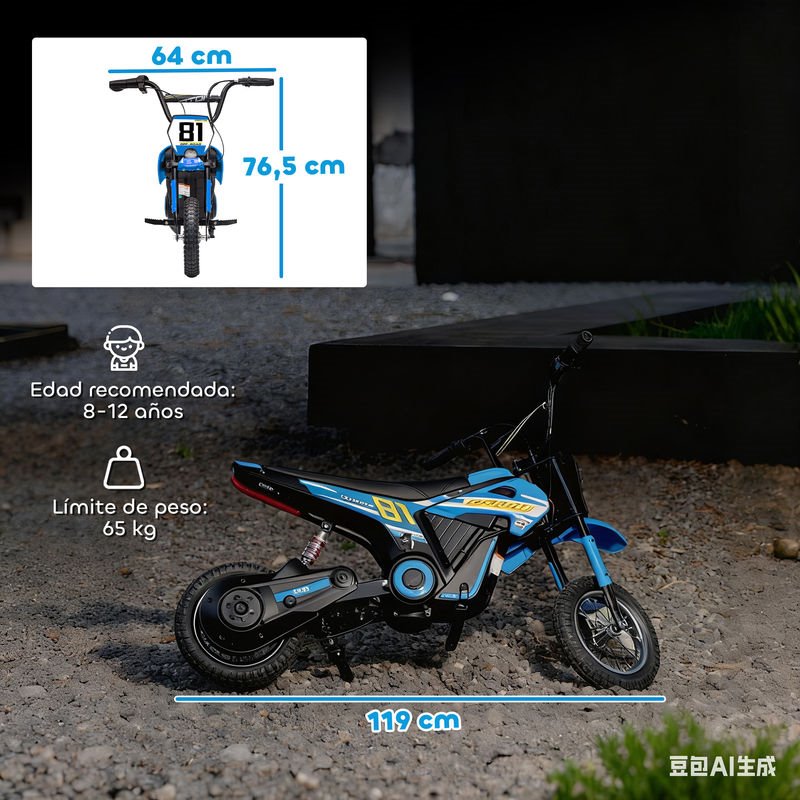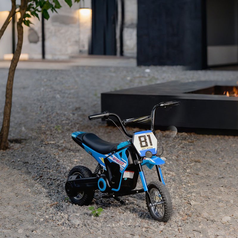 O seu pequeno sonha com aventuras fora do asfalto? Esta mota elétrica infantil da AIYAPLAY é ideal para explorar relva e caminhos de cascalho em segurança. Com acelerador de punho para um controlo suave, assento confortável e estilo motocross, oferece uma experiência real para viver grandes histórias ao ar livre. Características: - Esta mota de bateria para crianças conta com um motor de 24V 250W e 3 opções de velocidade para passeios controlados - Tem pneus de 12" e suspensão traseira que permitem percorrer terrenos irregulares com suavidade - O acelerador de punho giratório proporciona uma experiência de condução mais realista - O assento ergonómico de couro sintético garante um passeio confortável para as crianças - Conta com duas baterias de 12V 7AH para oferecer mais tempo de jogo sem interrupções - Está fabricada com estrutura de PP e metal para uma durabilidade e resistência superiores - A mota infantil está recomendada para crianças dos 8 aos 12 anos e suporta até 65 kg - É necessária montagem Especificaciones: - Cor: Azul e preto - Material: PP e metal - Medidas totais: 119x64x76,5 cm (CxLxA) - Medidas do assento: 48,5x16,5 cm (CxL) - Altura do assento: 50 cm - Medidas das rodas: Ø30,5 cm - Velocidade: 6-16 km/h - Motor: 24V 250W - Bateria: 12V 7AH x 2 - Tempo de carga: 8-12h - Autonomia de funcionamento: 40 min - Carga máxima: 65 kg - Idade recomendada: 8-12 anos - Referência: 370-393V90BU O pacote inclui: - ● 1 x Mota elétrica infantil; ● 1 x Manual de instruções