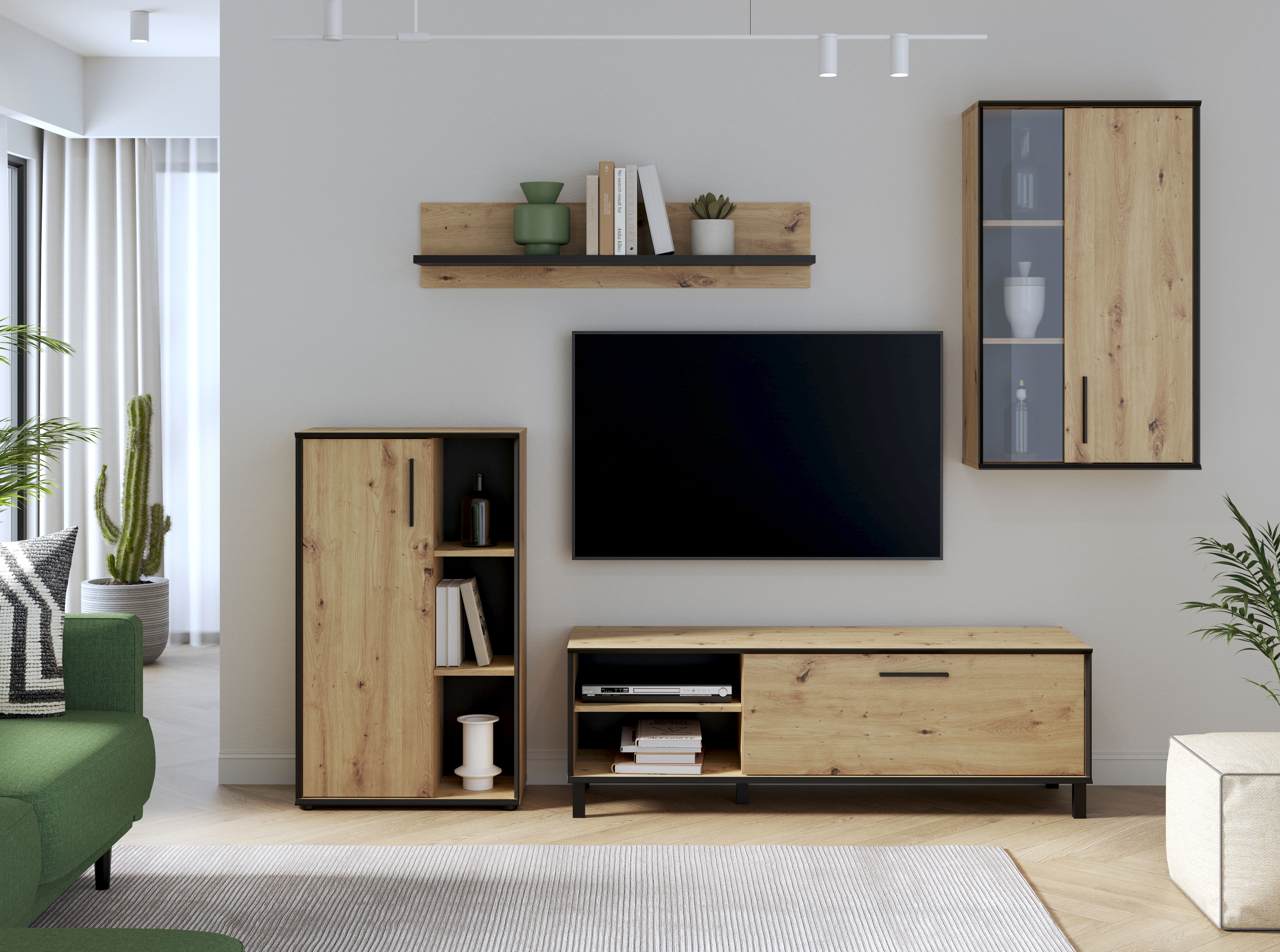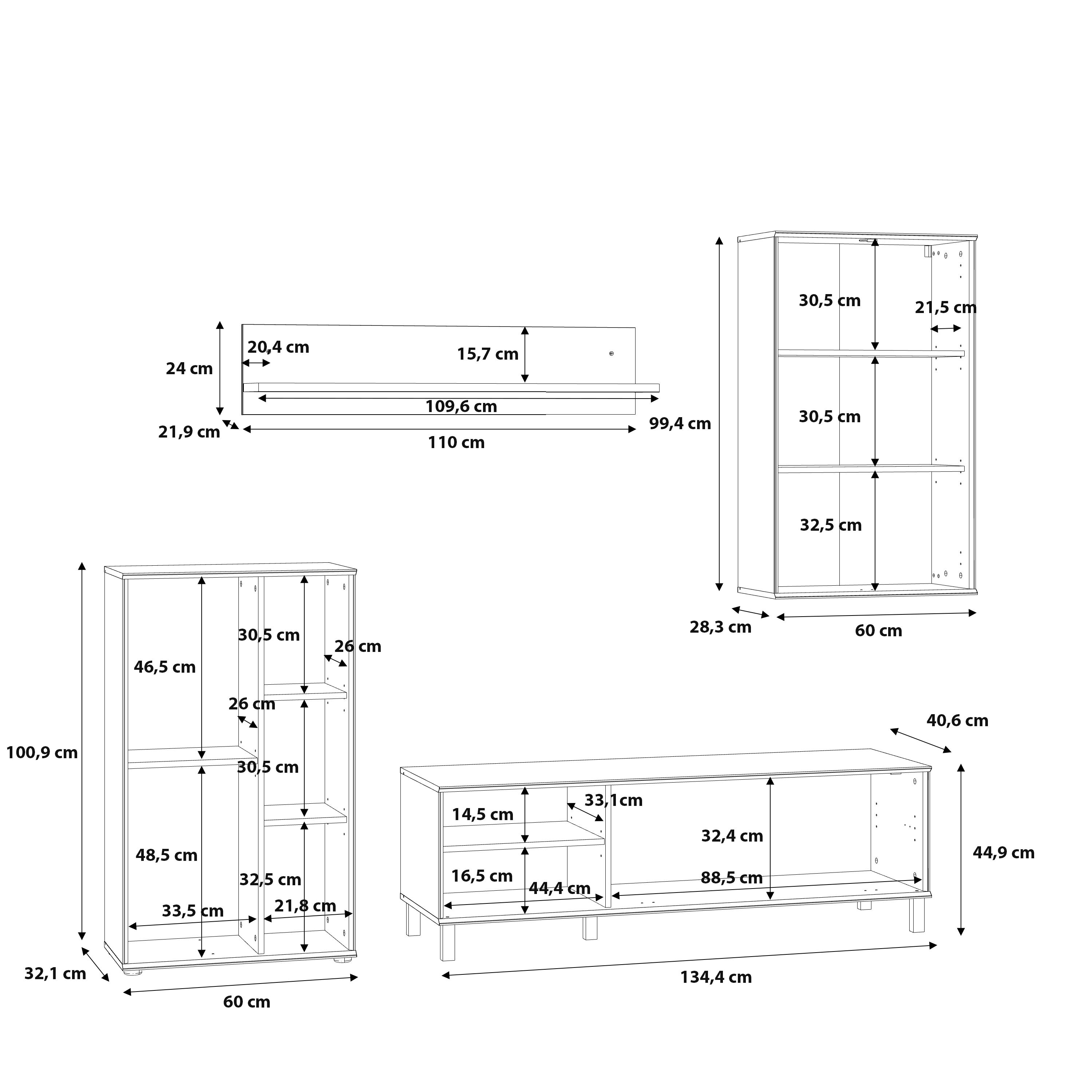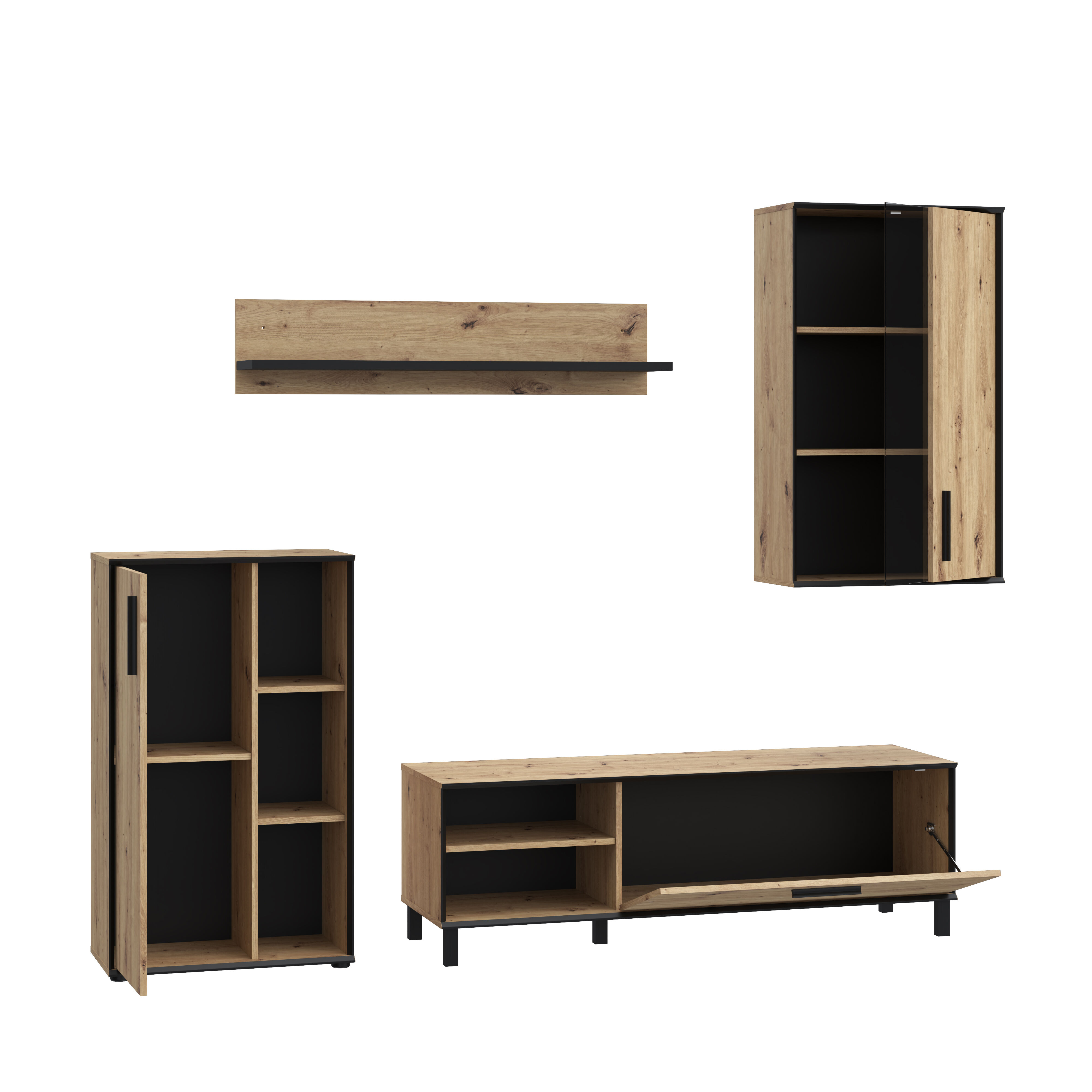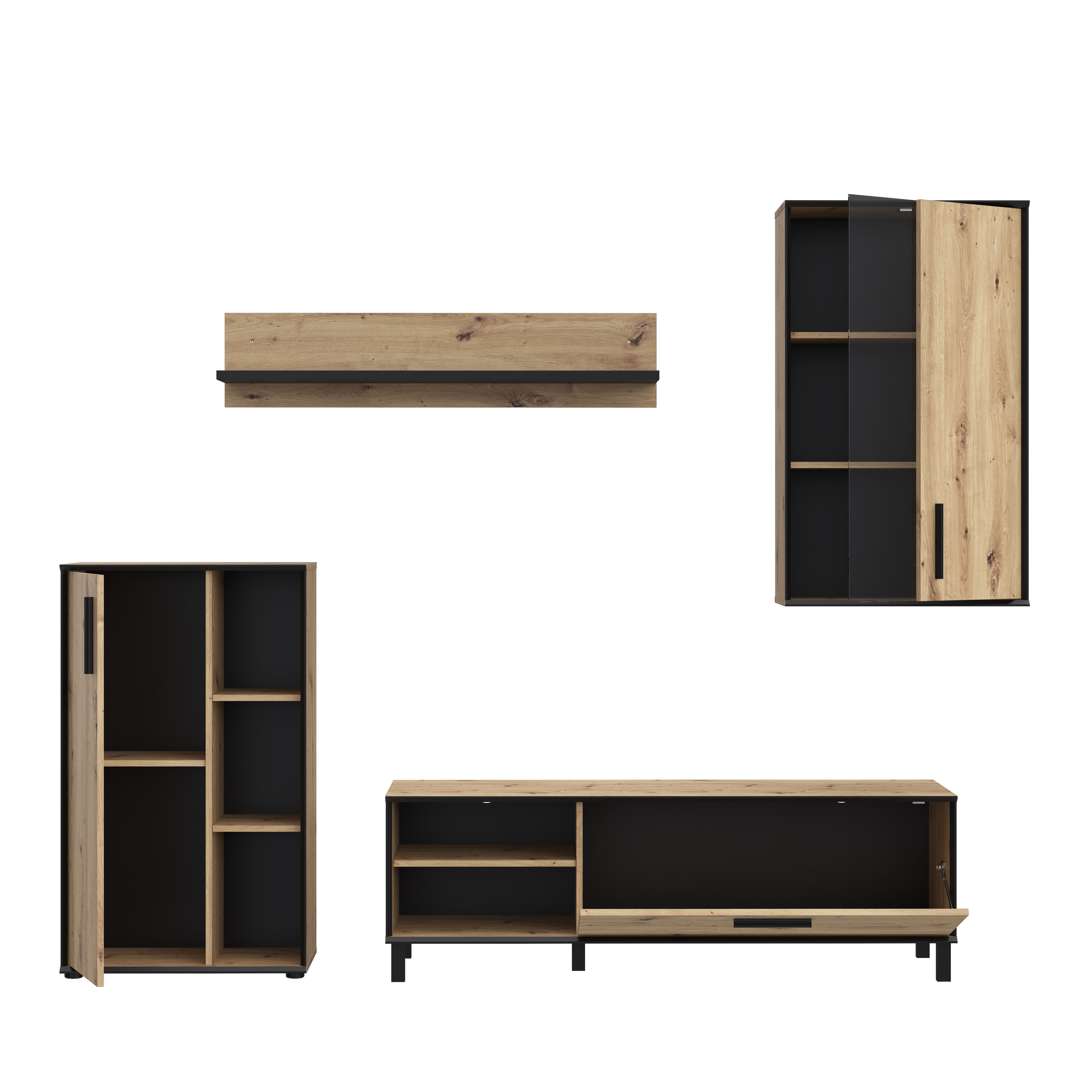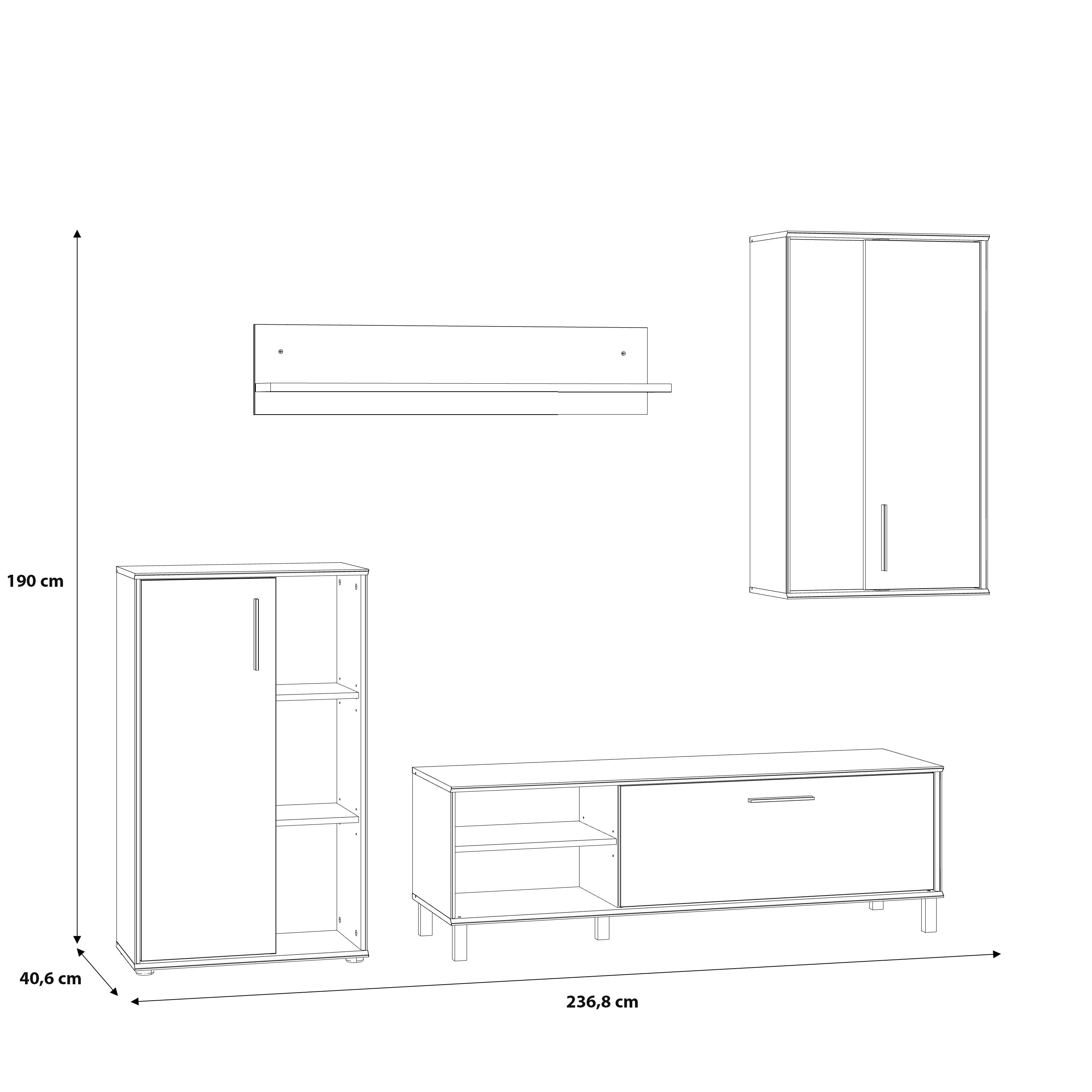 Compacto de TV Portopino, composto por 4 módulos, sendo 2 deles de parede, outro é uma mesa para a televisão que possui uma gaveta com porta basculante E, por último, um móvel que possui uma gaveta e três prateleiras. Trata-se de um design rústico com uma combinação das cores carvalho e detalhes em preto. A suas linhas simples e sofisticadas adaptam-se facilmente a todos os tipos de decoração, tornando-se a peça principal de qualquer sala de estar.