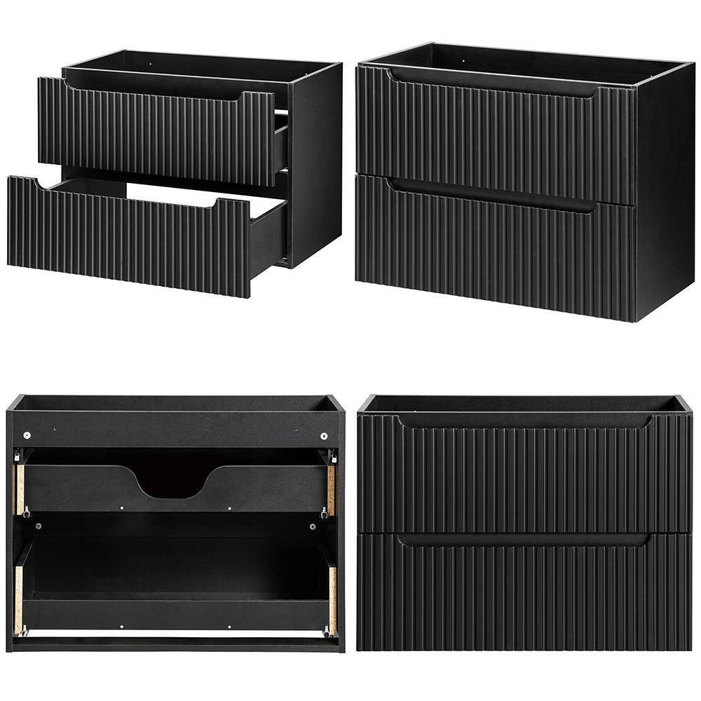 O móvel impressiona com as portas e gavetas de fecho suave, um design sem puxadores e um prático tampo de lavatório. Graças ao design suspenso na parede, a área do chão fica livre e a casa de banho parece maior e mais arrumada. Impressiona com os seus materiais robustos e acabamento de alta qualidade, o que garante tanto a durabilidade como uma aparência elegante.