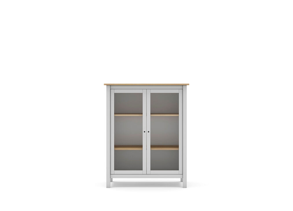 Móvel de Microondas 2P LANDHAUS. Com 2 portas de vidro. Feito com madeira de pinho e vidro, com acabamento branco e detalhes em carvalho. Medidas: 90 de largura x 110 de altura x 40 de profundidade centímetros. Este maravilhoso móvel de microondas oferece espaço de arrumação e x tra que é sempre bem-vindo. O seu design moderno é perfeito para todos que gostam de linhas naturais e funcionais para a casa.