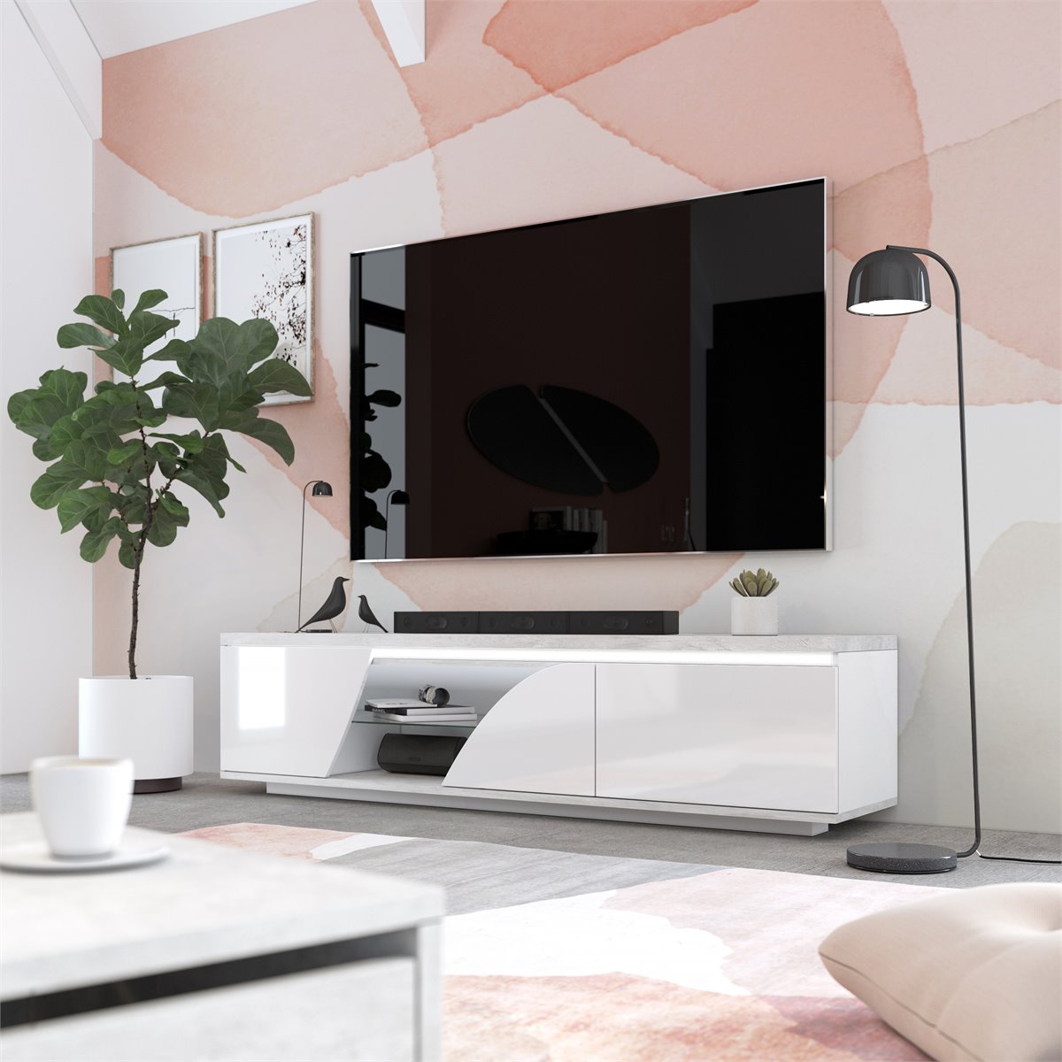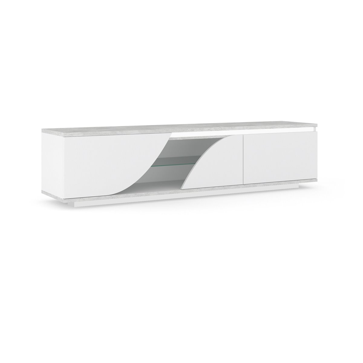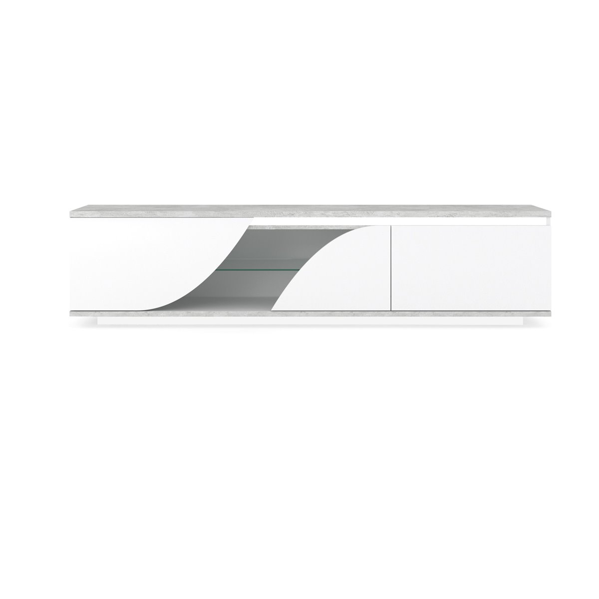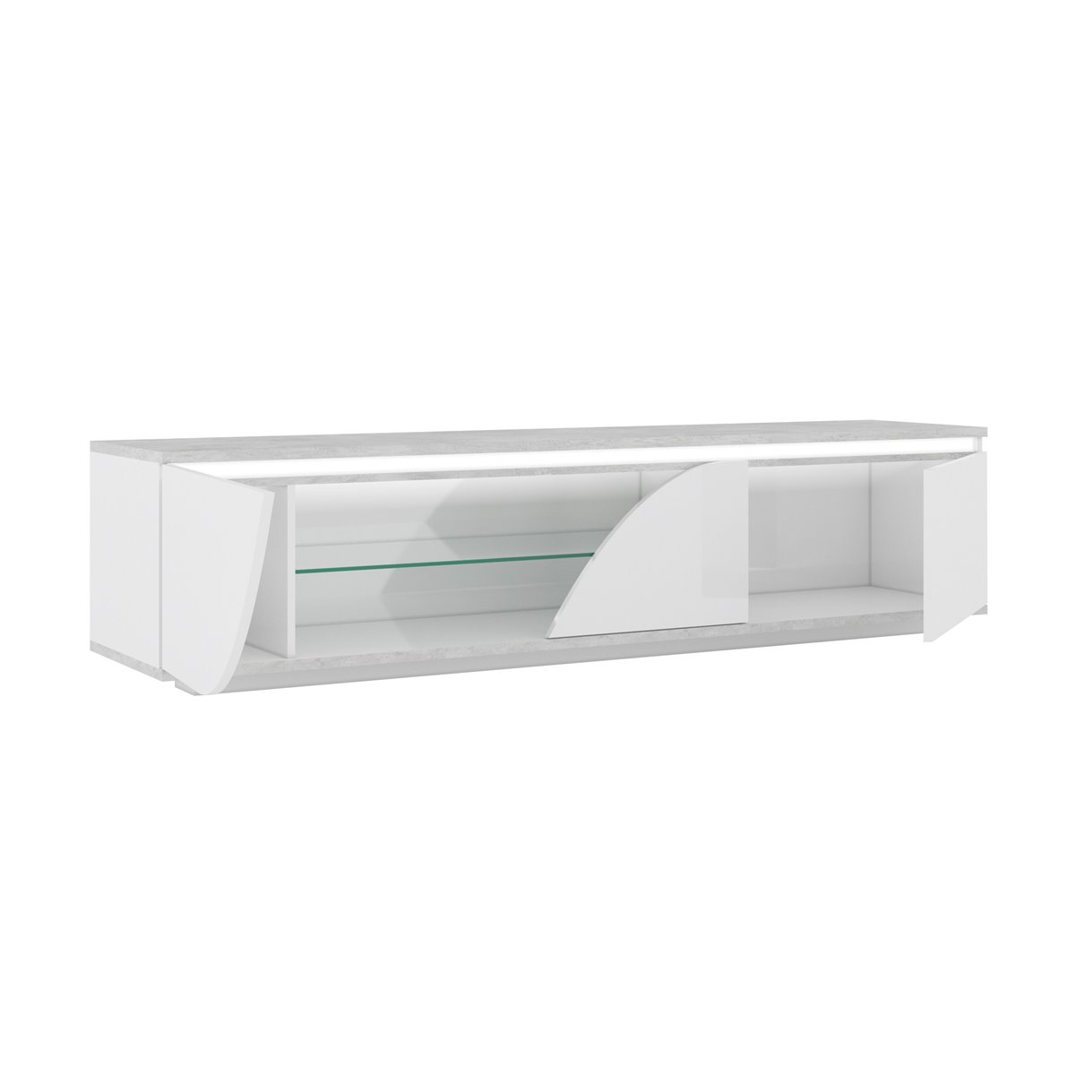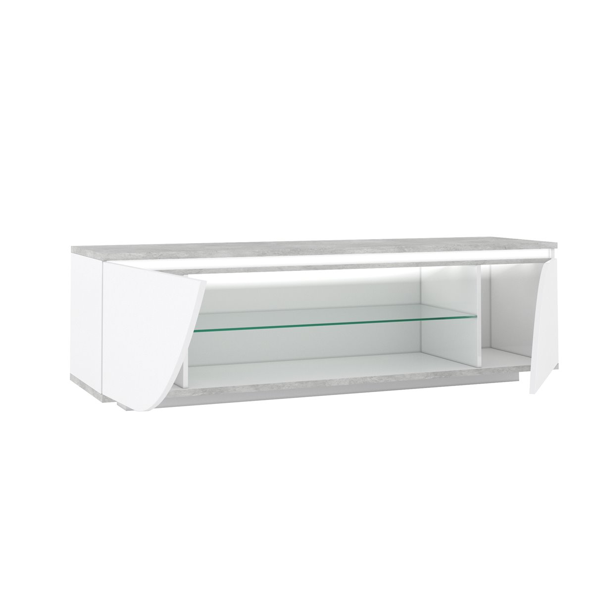 Procura o móvel perfeito para a sua televisão? Apresentamos o elegante e funcional móvel de TV GOYA. Medindo 165 cm de comprimento, este móvel possui 2 portas e um espaço adicional com prateleira de vidro, perfeito para os seus dispositivos multimédia. Fabricado em aglomerado de partículas lacado a branco e cinza, este móvel vai dar um toque moderno à sua sala. Além disso, as luzes LED incluídas vão criar um ambiente acolhedor em seu redor.