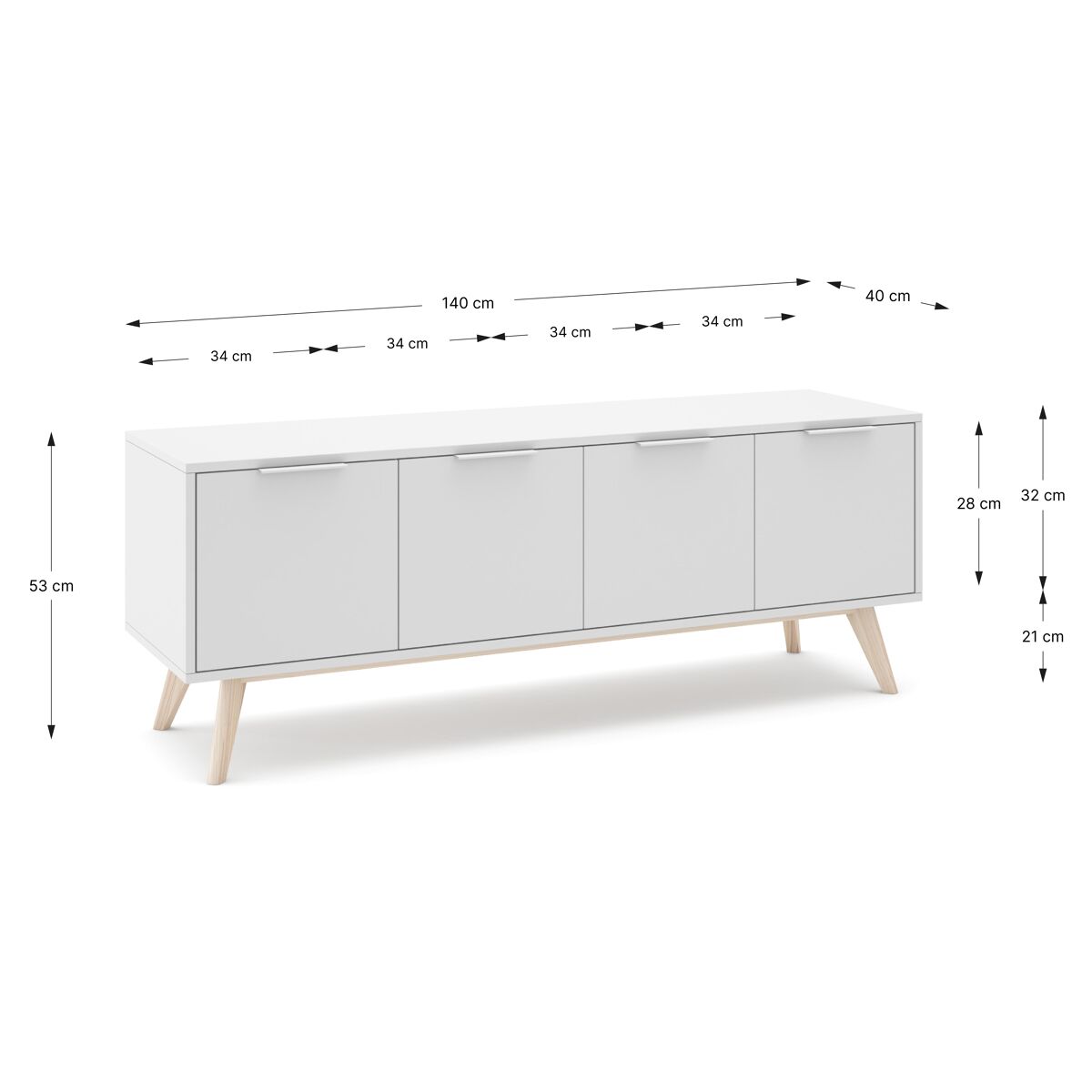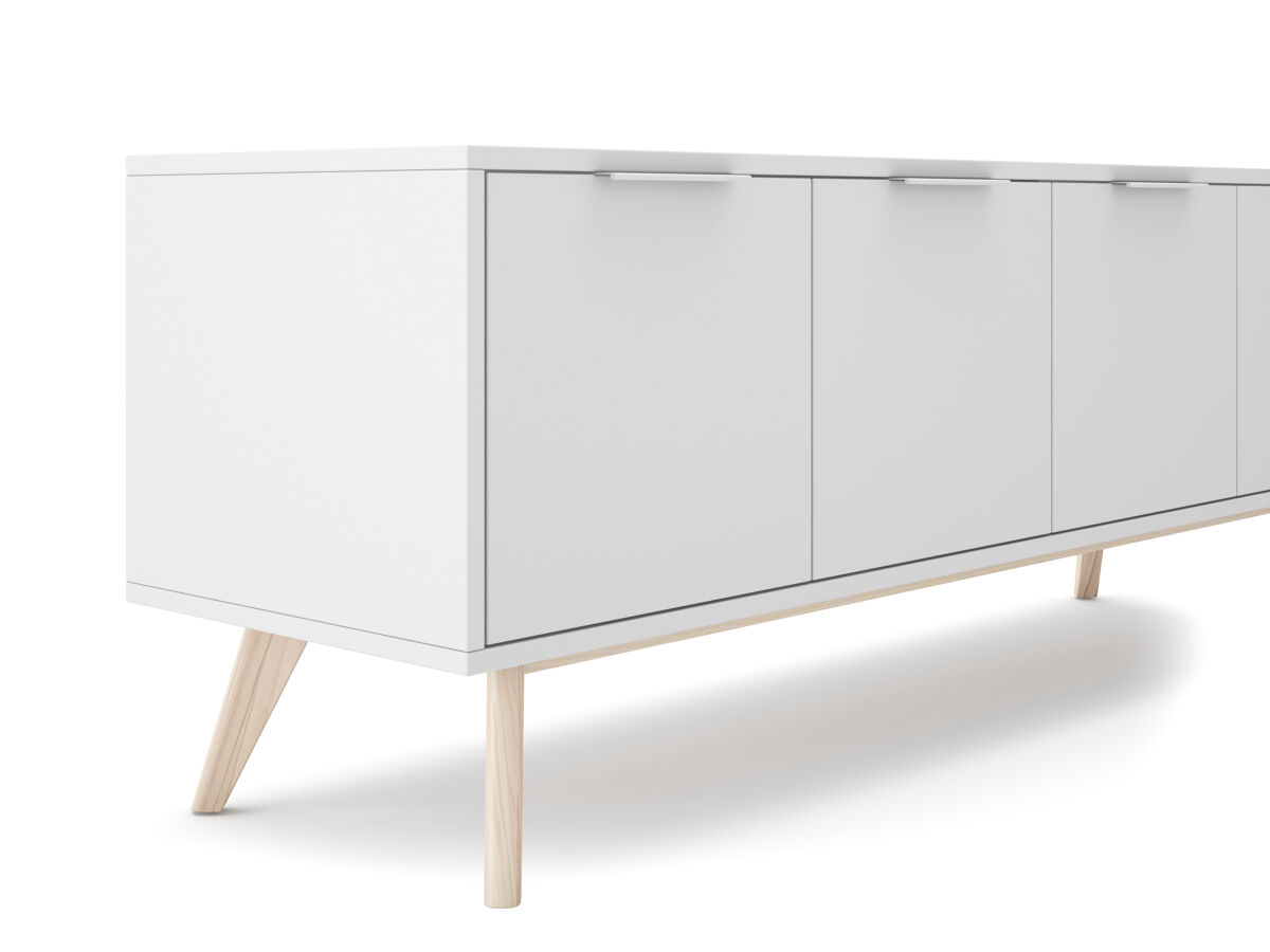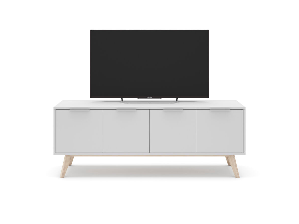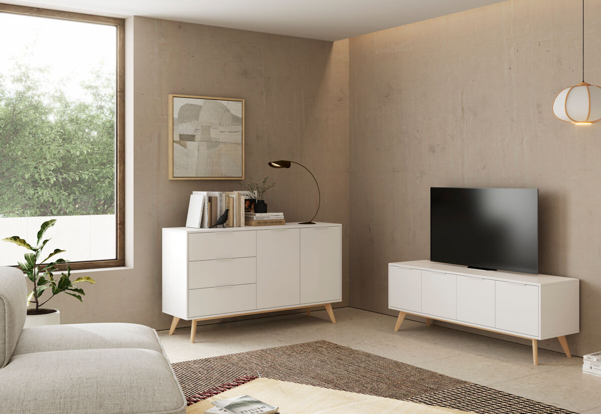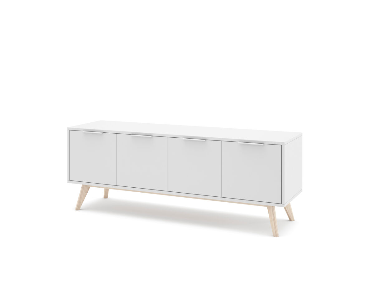 O móvel de TV VOLGA destaca-se pelo design funcional e moderno, ideal para otimizar o seu espaço de entretenimento. Com 4 portas e 2 compartimentos interiores, oferece um amplo espaço para organizar os seus aparelhos eletrónicos e manter a sala de estar bem-arrumada. Fabricado em madeira de pinho, com um elegante acabamento em branco, este móvel traz um toque natural e fresco a qualquer tipo de divisão. Os pés em madeira clara complementam o design, proporcionando maior estabilidade.