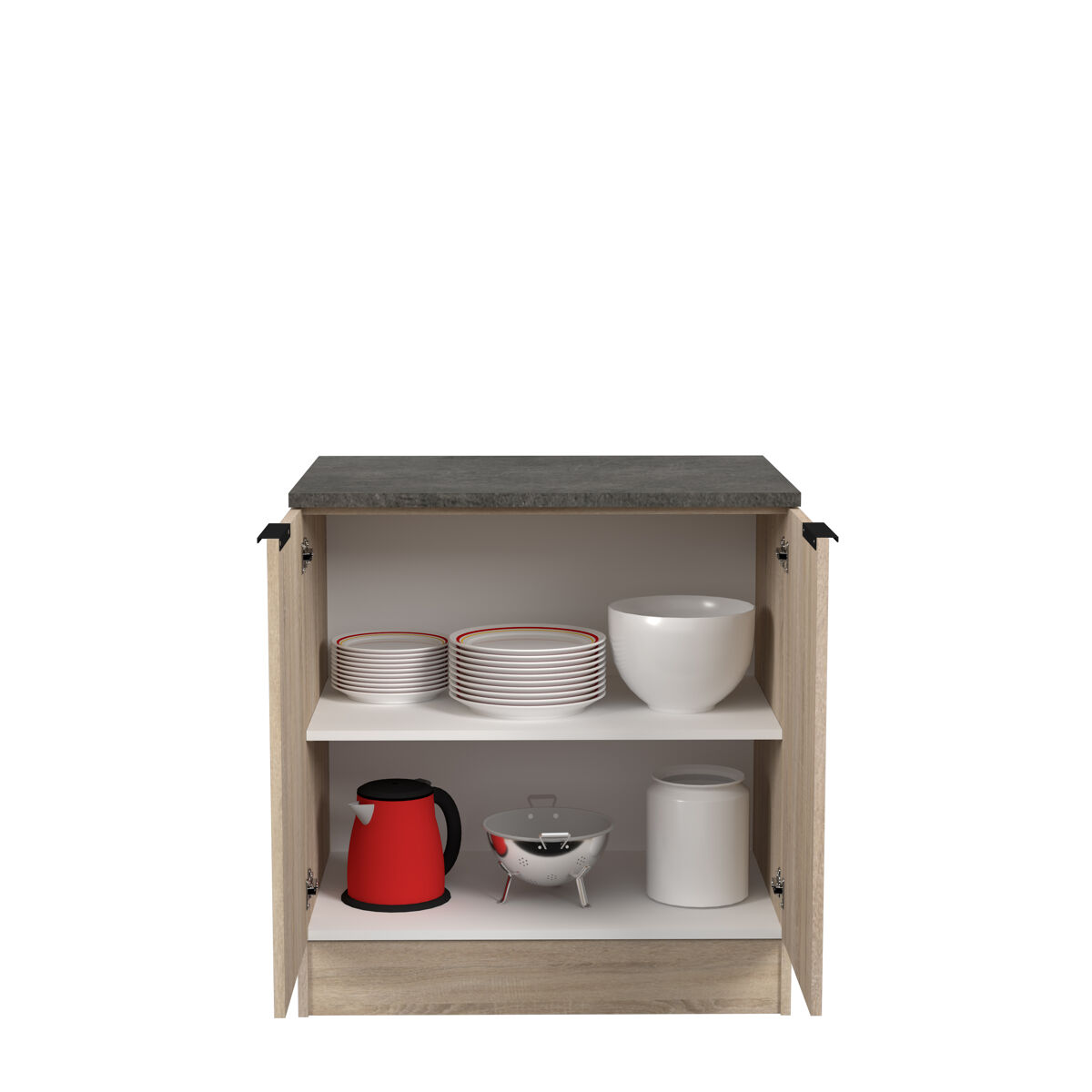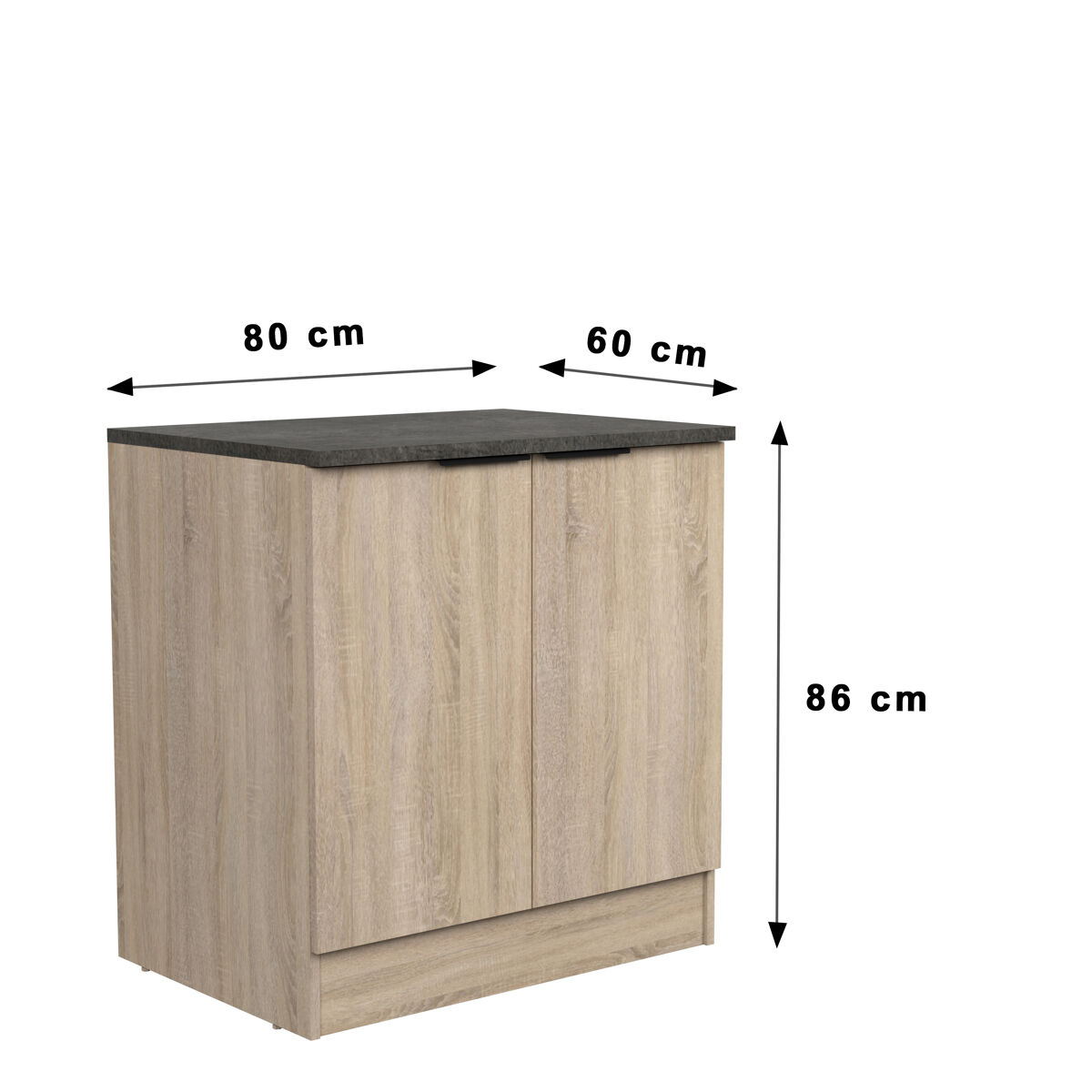 Móvel inferior FUMAY de 80x86x60 cm com duas portas. Tampo individual de efeito cimento escuro. Fabricado em aglomerado de partículas revestido a folha de carvalho. Puxador com acabamento em alumínio preto. Ideal para quem gosta de ter uma cozinha adaptada às suas necessidades com um design bonito e ao melhor preço. Não espere mais e encomende já um escolha móvel que se adapta perfeitamente à sua cozinha.