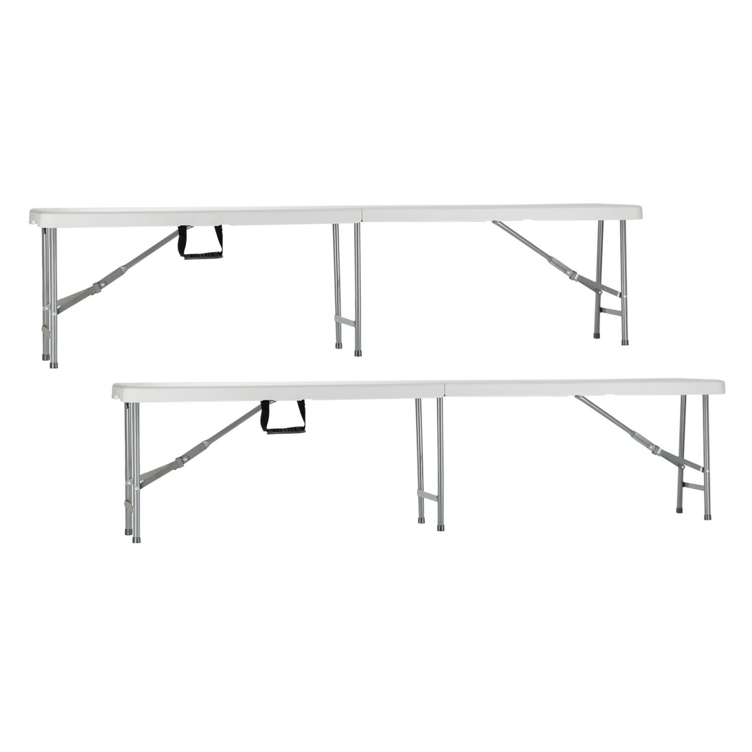 Pack de 2 bancos dobráveis de exterior de 180cm da Orion91, a opção perfeita para desfrutar do bom tempo no seu jardim ou terraço. Ideal para uso interior e exterior. Uma peça essencial em restauração e parques de campismo. Possui um sistema de segurança e bloqueio, bem como uma pega de borracha para facilitar o transporte. O banco pode ser facilmente dobrado e convertido numa pequena pasta muito cómoda de guardar.