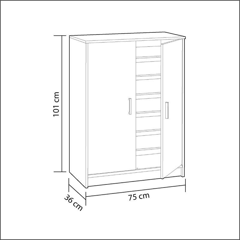 A sapateira Basic Wide é um móvel de quarto com linhas simples e práticas. Facilita a arrumação do calçado, com 7 compartimentos que podem conter até 30 pares de sapatos .