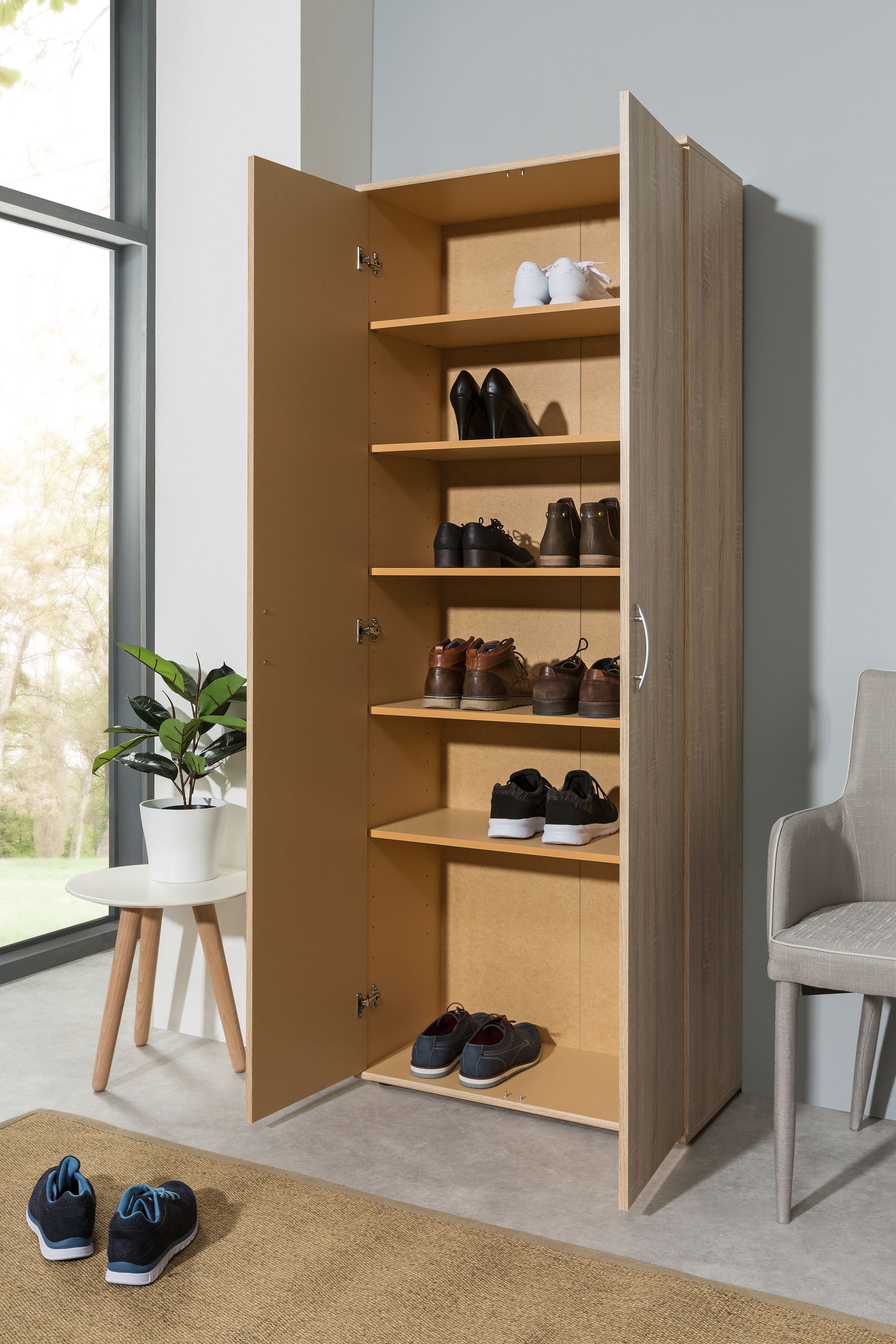 Atualize o seu conjunto de armazenamento de sapatos com esta elegante sapateira de 2 portas BIGGER! A elegante cor carvalho e as alças de metal trarão um toque moderno a qualquer divisão, enquanto a estrutura de aglomerado proporciona durabilidade superior. Com 5 prateleiras ajustáveis e design de duas portas, você pode facilmente armazenar até 18 pares de sapatos em um local conveniente. Não se contente com guarda-roupas estreitos, organize seus sapatos em grande estilo com a sapateira de 2 portas e 5 prateleiras BIGGER