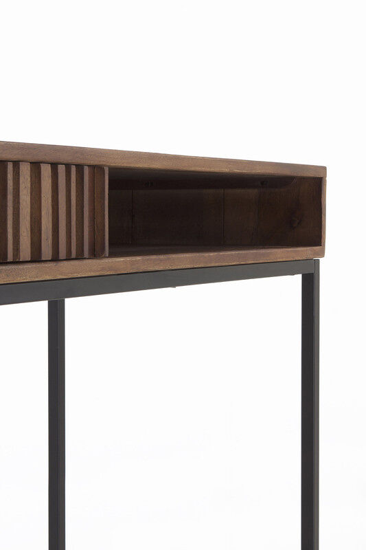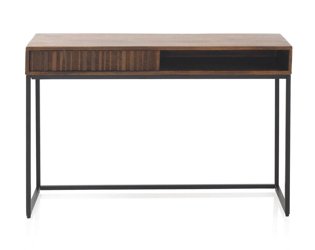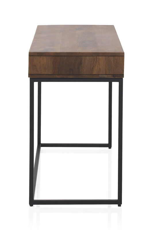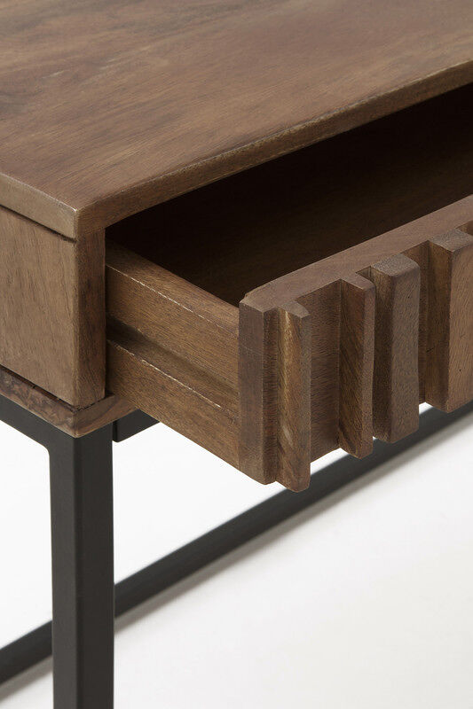 A secretária é feita de madeira maciça de manga natural, com uma base metálica. Possui uma gaveta com frente laminada e relevo. As medidas do encaixe direito são 56x43x9,5 cm e a distância interna entre os pés é de 110 cm. Não é necessário montar, apenas o pé da base precisa ser encaixado. É uma peça elegante e funcional para decorar e organizar seu ambiente de trabalho.