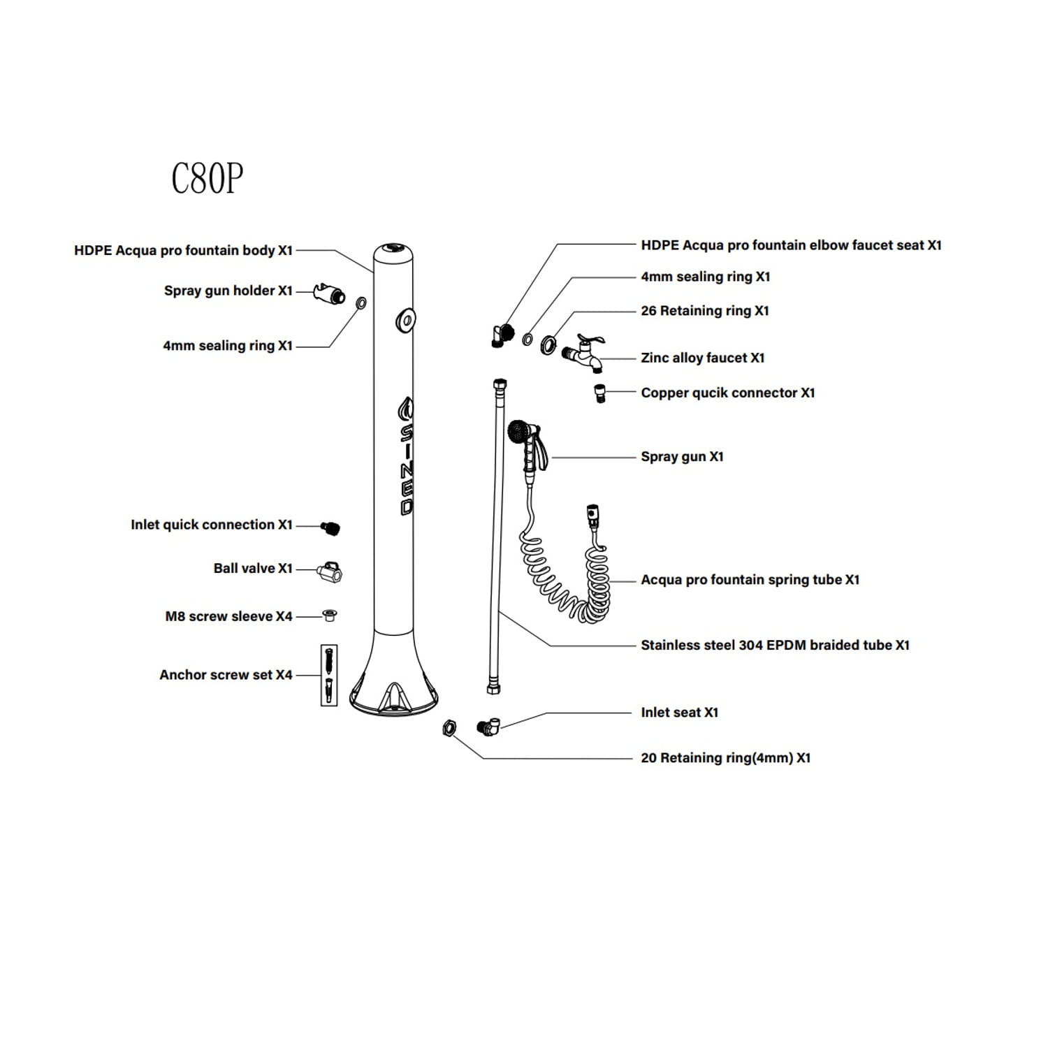 Por exigência popular dos nossos clientes, criámos a fonte exterior de cor de pomba SINED, completa com suporte metálico para mangueira de jardim e mangueira exterior de 7,5 m com pistola de pulverização com 8 jactos diferentes. Recomendado para todas as actividades ao ar livre, tanto públicas como privadas, dada a qualidade da construção com acessórios exclusivos. A ligação lateral da água é feita de HDPE (polietileno de alta resistência) resistente aos UV, calcário e salinidade, também perfeita para ambientes marinhos. No interior da mangueira de alta qualidade que suporta uma pressão até 15 bar com um comprimento de 80 cm, diâmetro interior de 6 mm e diâmetro exterior de 14 mm.Principais características- Ideal para actividades ao ar livre, jardins, condomínios, piscinas, praias, áreas para cães, hotéis, parques de campismo- Altura 100 cm- Diâmetro 8 cm- Torneira de liga metálica mate preta- Arranjo para acoplamentos rápidos de mangueiras de jardim- Mangueira 7,5 m externo - Pistola de pulverização 8 jactos diferentes - Suporte metálico para mangueiras de jardim - Cavilhas de fixação incluídas - Mangueiras internas de metal trançado de 15 Kgs - Entrada de água apenas no lado - Facilmente deslocável - Instalação fácil e imediata - Não é necessária nenhuma habilidade especial de montagem - Facilmente sanitizável- Fonte feita de PEAD (polietileno de alta resistência) resistente aos UV, geada, calcário e sal - Adequada para todas as actividades ao ar livre, também para ambientes marinhos - Ideal para regar o jardim ou áreas exteriores - Fácil de montar, adapta-se facilmente a uma variedade de ambientes - Fácil de limpar - Utiliza detergentes disponíveis comercialmente para limpeza. Não utilizar produtos de limpeza que contenham solventes, produtos de limpeza abrasivos ou esponjas duras, escovas, etc.