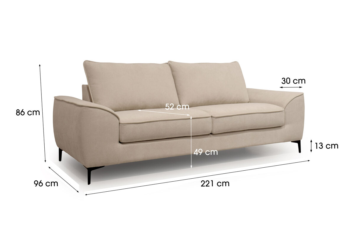Com o modelo BOSCO é possível ter o sofá dos seus sonhos! Com um elegante design bege, estrutura em madeira e revestimento em tecido de alta qualidade, este sofá de 3 lugares é o complemento perfeito para a sua casa. Desfrute do melhor conforto graças à abertura de estilo italiano e às pernas em metal preto. Medindo 221 cm de largura, 86 cm de altura e 96 cm de profundidade, o sofá BOSCO é a escolha ideal para a sua sala. Adquira-o e transforme o seu espaço com estilo e conforto incomparáveis!