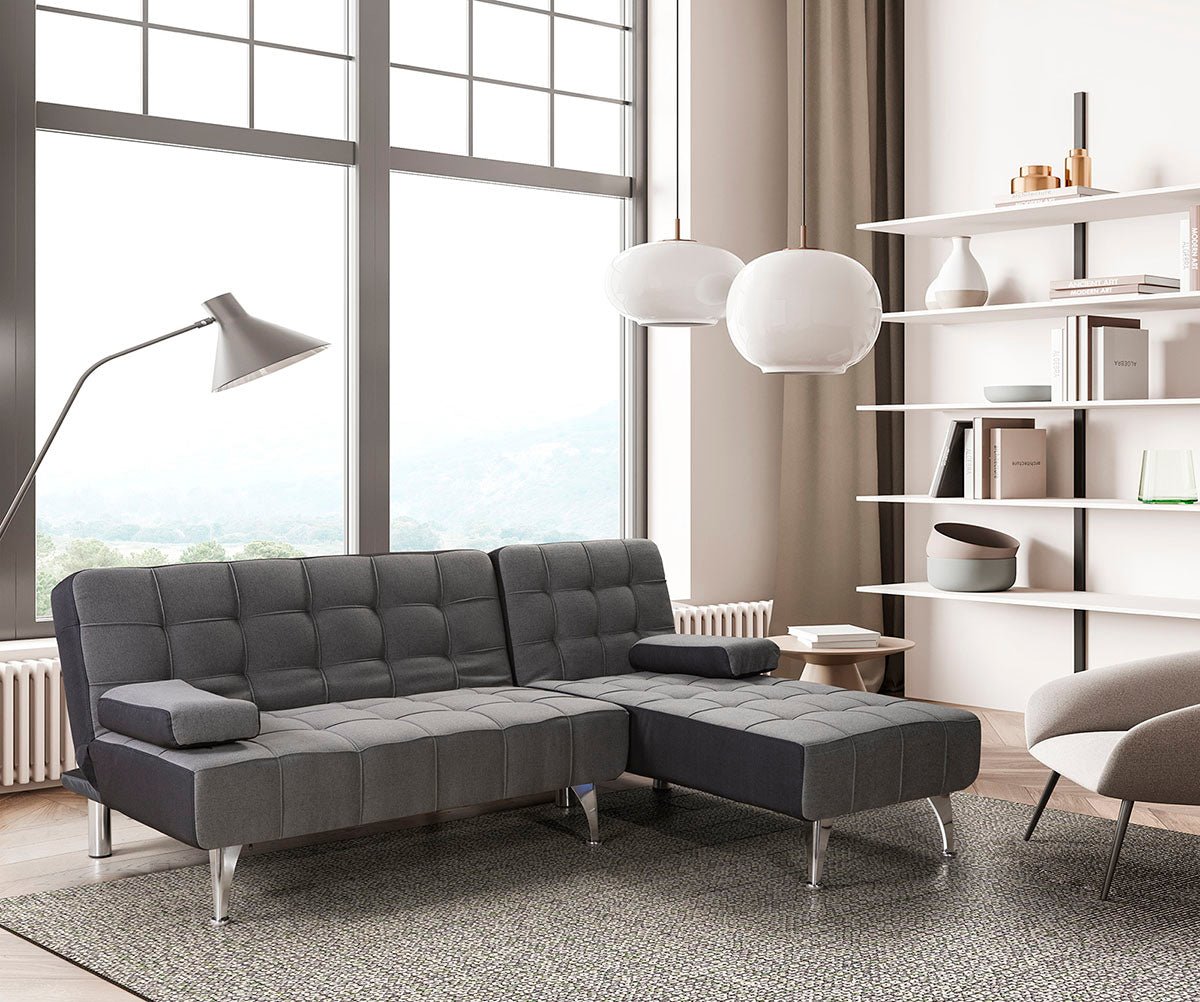 Sofá Chaise Longue Multifuncional ideal para pequenos espaços. É a combinação perfeita de estilo e conforto. Conversível em cama e reversível, este Sofá-cama Chaise Longue possui sistema de abertura click-clack. Você pode escolher o lado da espreguiçadeira que mais gosta, pois possui 2 módulos independentes, não ancorados.