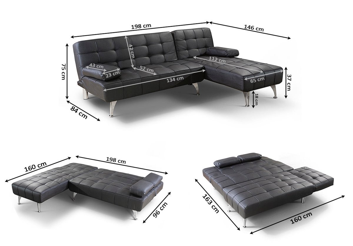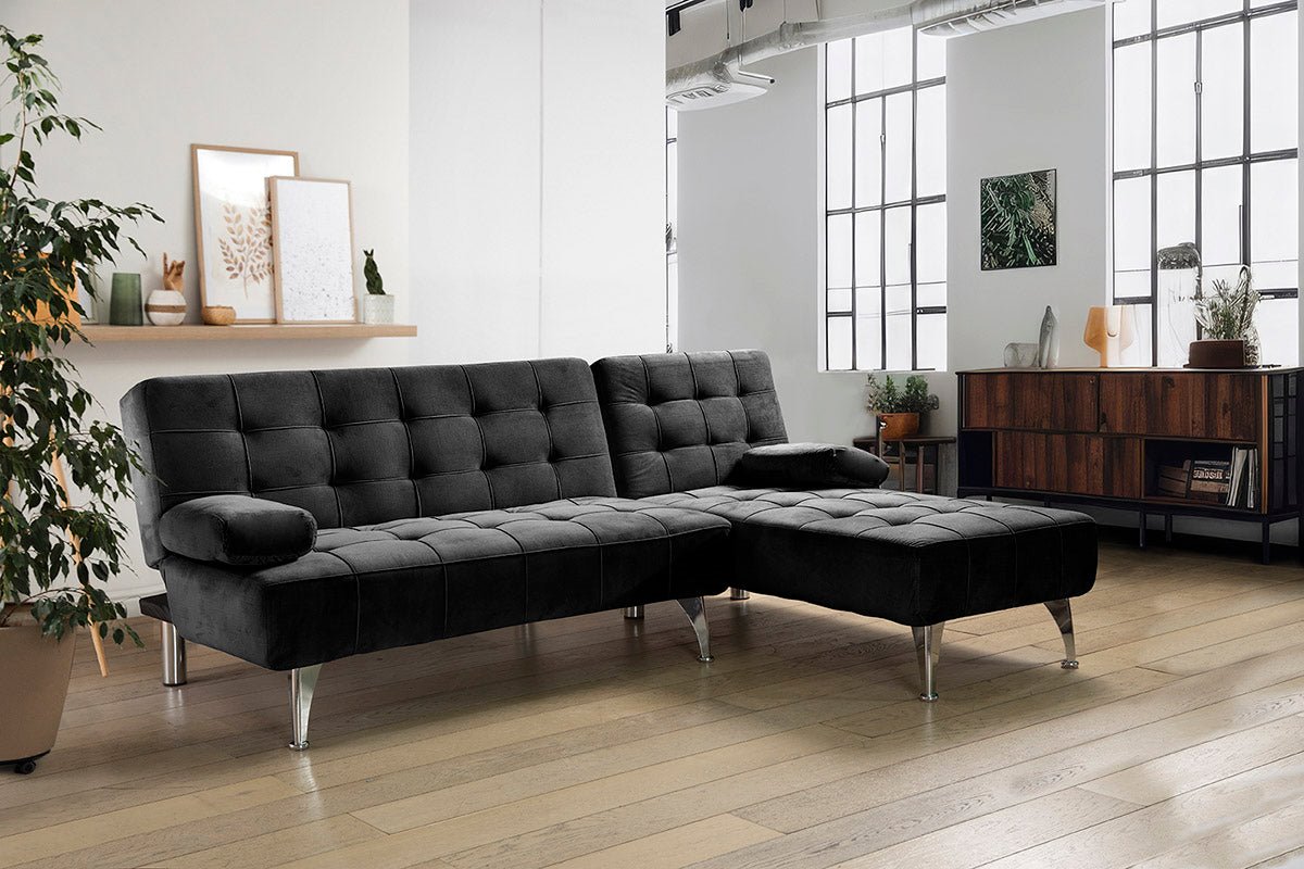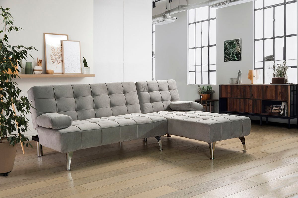 Feito com estrutura de madeira, o Sofá Cama Chaise Longue XS tem 3 lugares, possui estofamento de espuma, pés metálicos e molas em zigue-zague. Disponível em couro sintético, tecido e veludo em diversas cores. Inclui 2 almofadas. Fácil de montar.