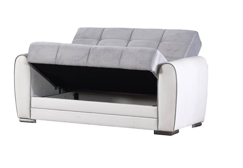 Sofá-cama Dlobuon, Sofá-cama container de canto em couro ecológico e tecido, Sofá da sala com abertura click-clack e península reversível, 163x84h91 cm, Branco e Cinza.