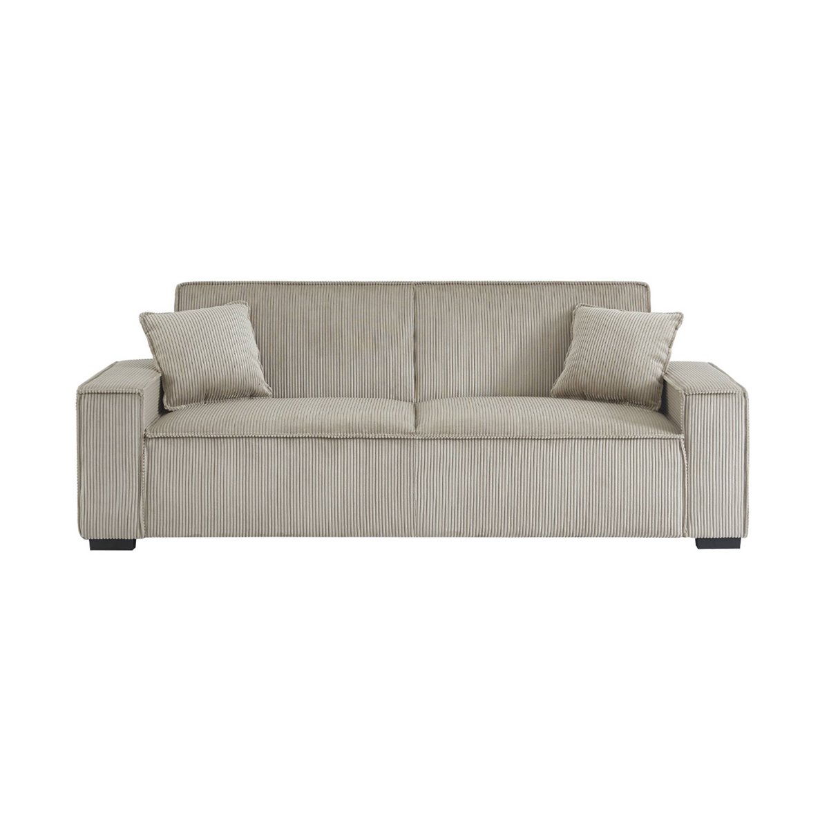 O sofá de 3 lugares Feel é uma mistura perfeita de elegância e modernidade. Com a sua estrutura em madeira de eucalipto e contraplacado, garante uma estabilidade duradoura. Com as suas duas almofadas macias e a veludo cotelê com nervuras largas, sentir-se-á como se estivesse enrolado numa nuvem. Além disso, o seu encosto reclinável pode ser ajustado de acordo com as suas necessidades. Excecionalmente macia e confortável, esta poltrona também pode ser convertida numa cama para convidados inesperados.