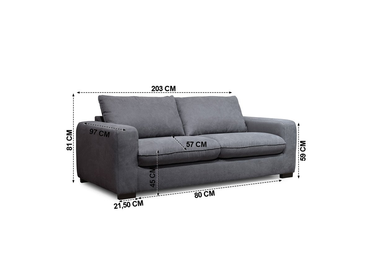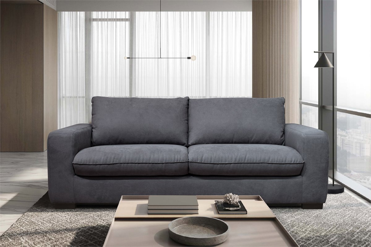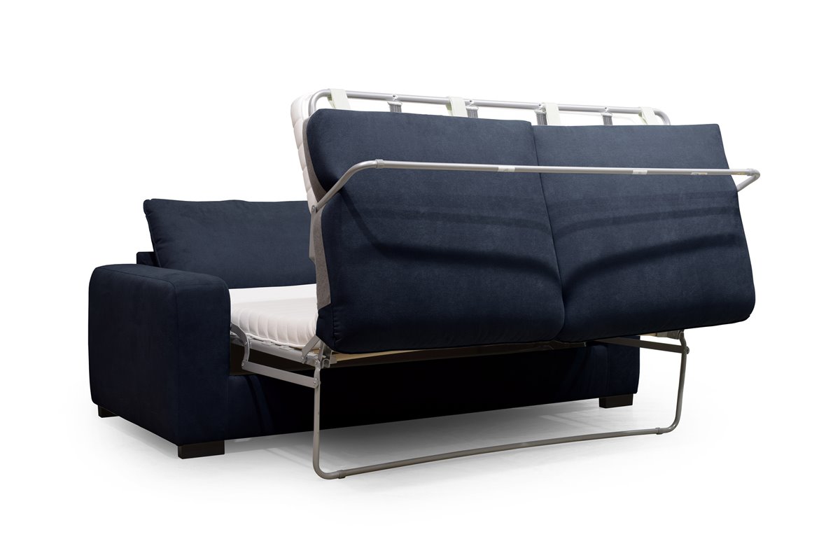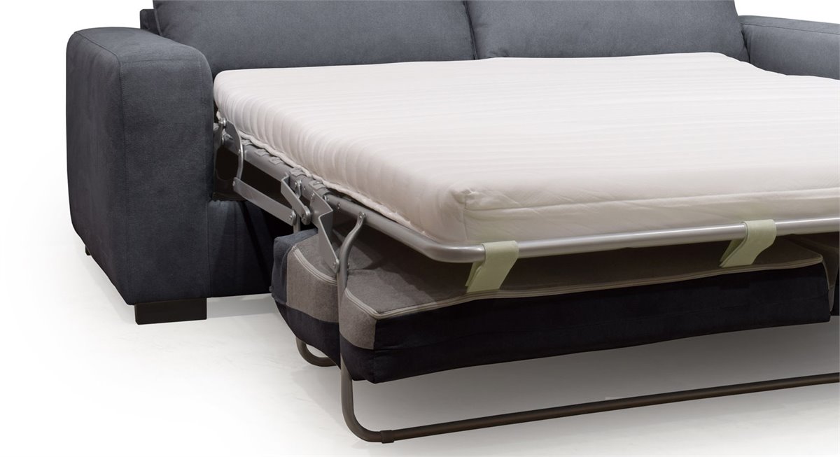 O sofá-cama SWEET 3 lugares tem um revestimento de tecido 100% poliéster Enjoy, e pode ser convertido em uma cama com as medidas 140x190cm. É feito de madeira maciça e aglomerado. Tem um colchão de 10cm de espessura com espuma de 30kg RH (alta resiliência). A parte superior da cama é com lâminas de madeira para uma acolhida flexível, a parte inferior é com alças elásticas. Os assentos têm uma espuma de 28Kg/m3, as 2 almofadas das costas são 100% fibra, o que permite um ótimo conforto das costas. Os pés são em PVC preto.