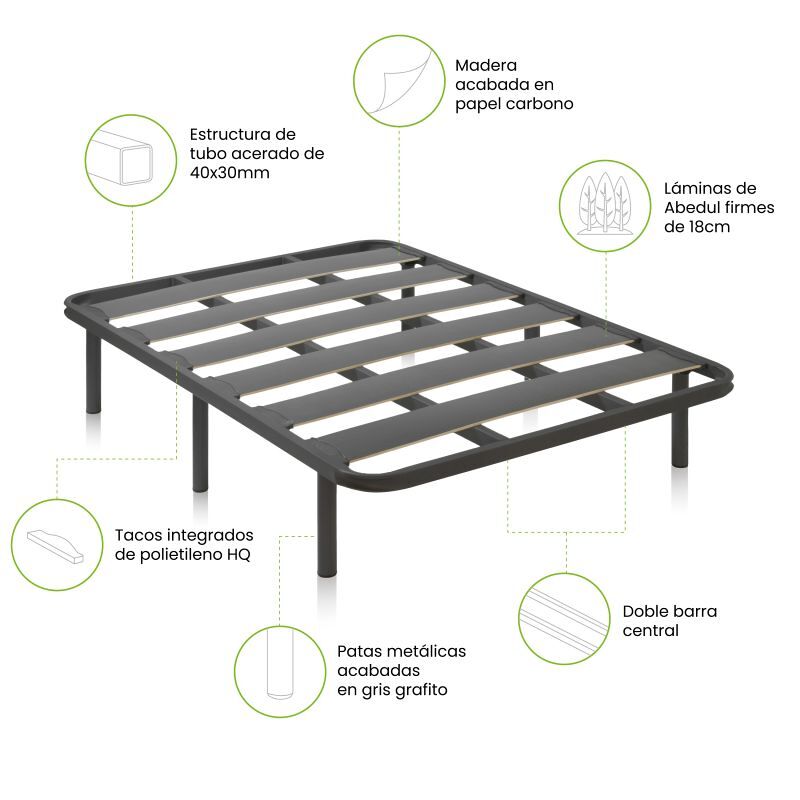 - Altura total 30cm: Se escolher a opção com pernas, a base de ripas RX Carbon terá uma altura total de 30cm e um espaço vazio de 25cm para elevar a base à altura ideal para o seu conforto.