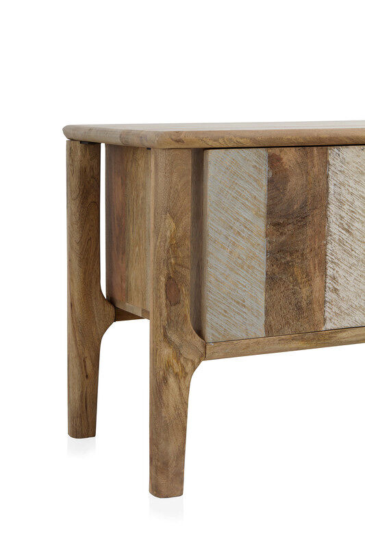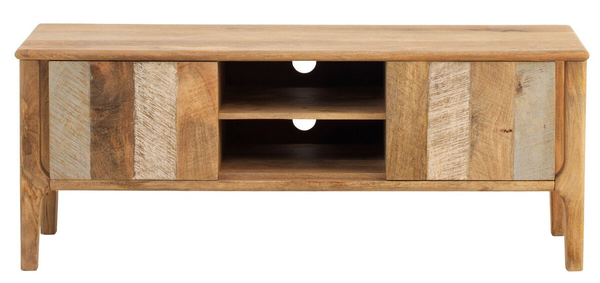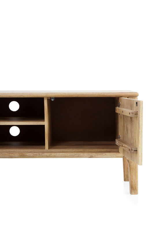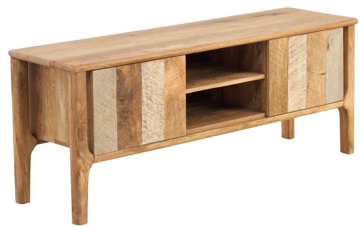 Móvel TV de 140 cms de madeira de magueira em tom natural com duas portas. As portas estão decoradas com degradado de cores.