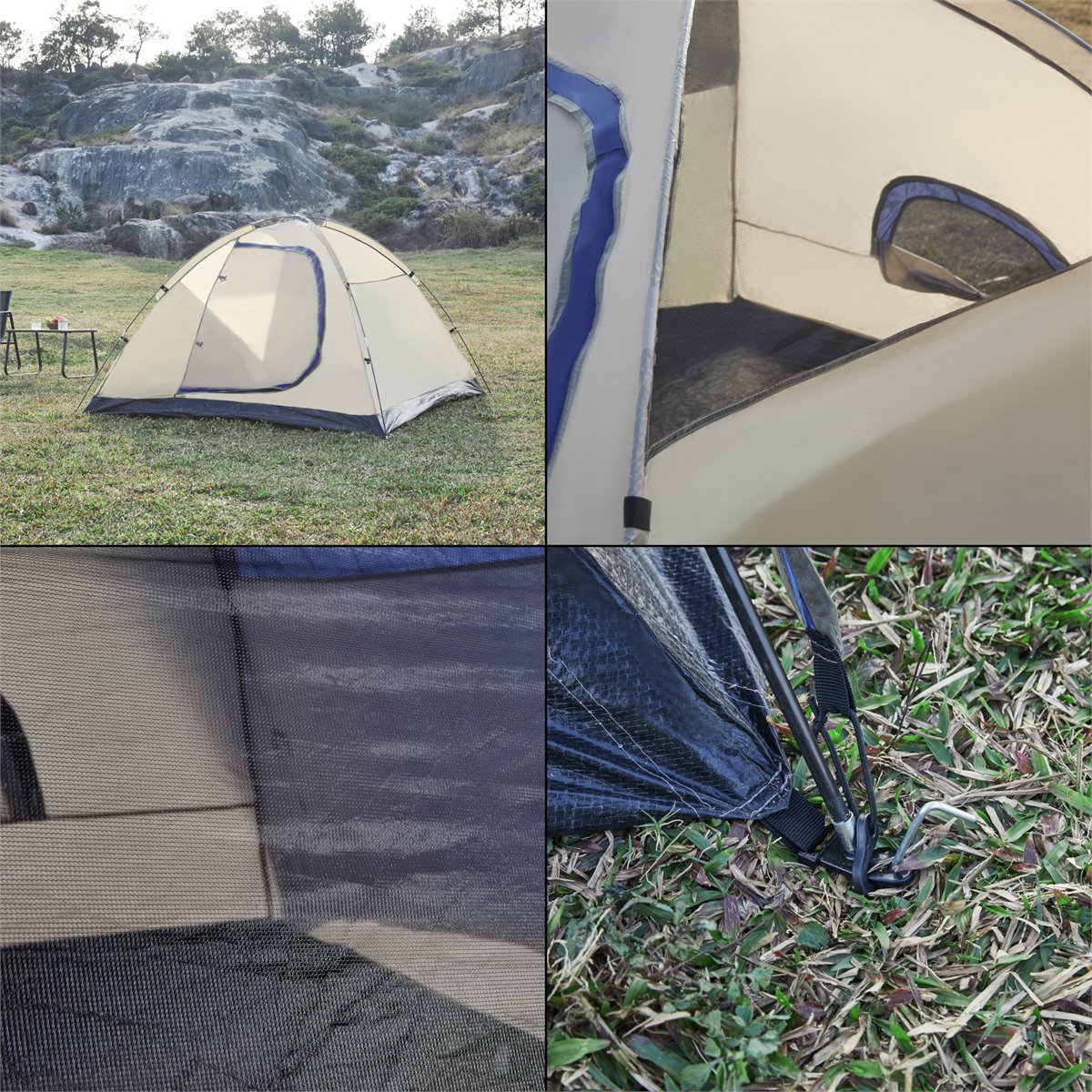 As cavilhas robustas, que podem ser utilizadas para fixar firmemente a tenda de exterior ao solo, e os cabos de sustentação, que garantem uma base segura mesmo em condições de vento, proporcionam estabilidade e segurança adicionais. Isto torna a tenda um abrigo fiável para todas as actividades ao ar livre.