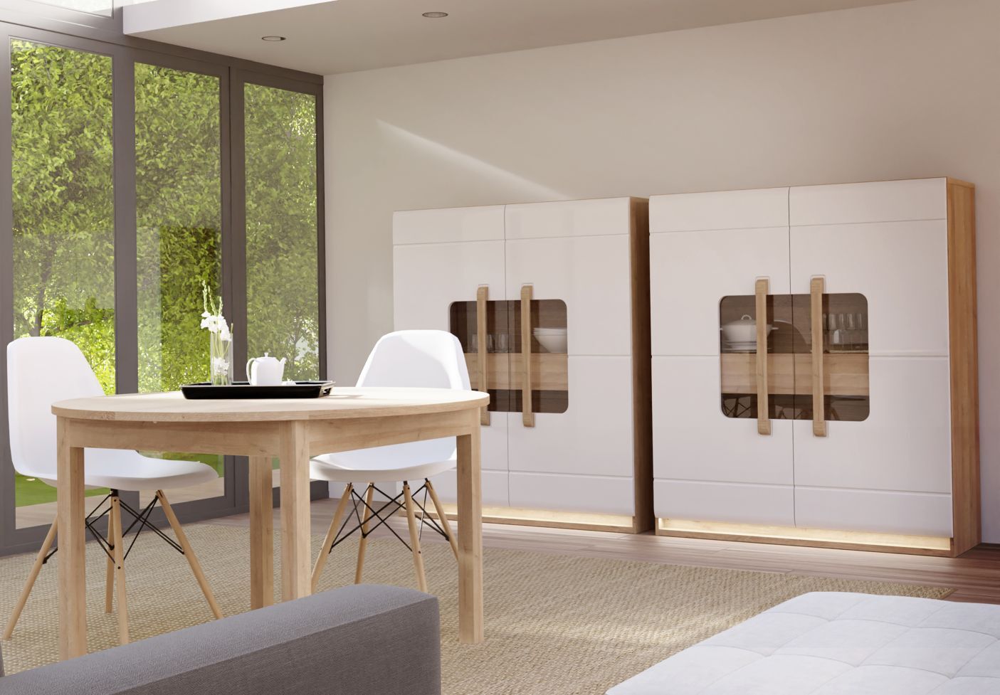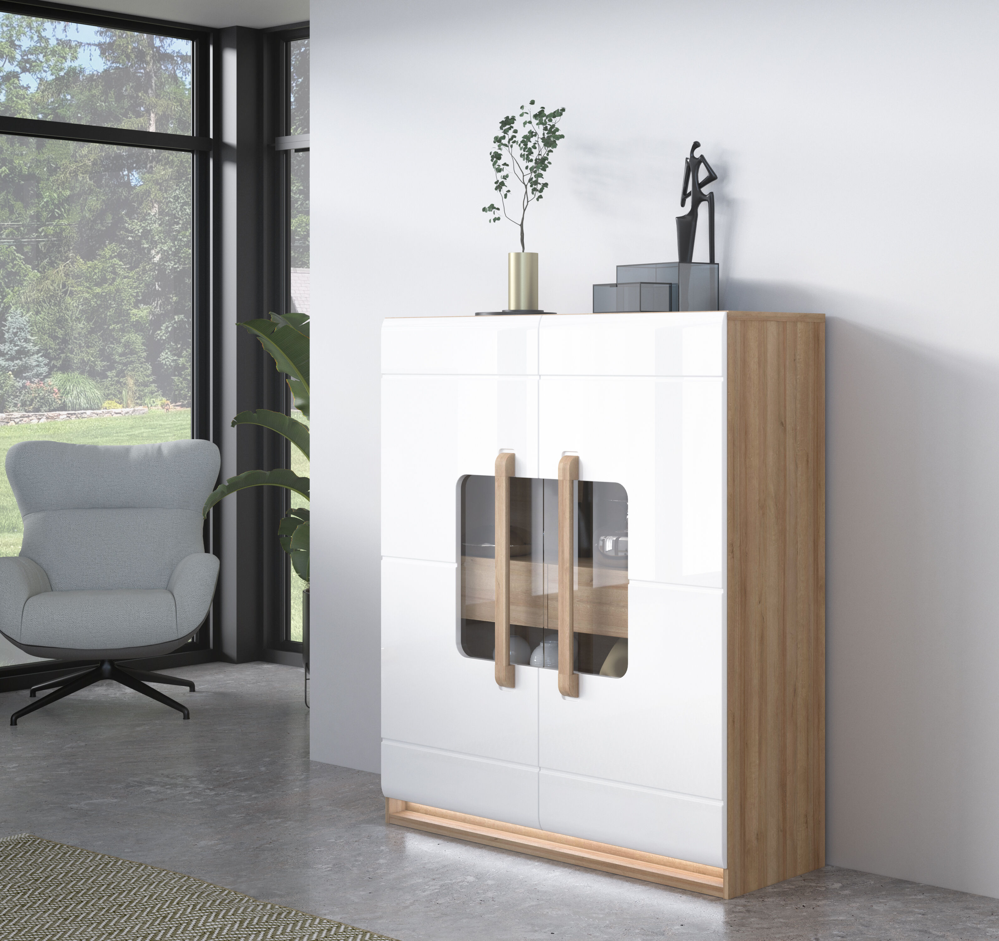 Sinta a inveja dos seus convidados com a vitrine MONTREAL. Com um design vanguardista espetacular, esta vitrine é ideal para exibir os seus objetos favoritos. A iluminação LED com flashes verdes no rodapé, tornam esta vitrine no centro das atenções. O sistema de fecho suave garante que tudo aquilo que lá estiver guardado fica protegido contra movimentos indesejados. O que guardar no seu interior fará parte da decoração da sua sala graças à vitrine MONTREAL, sempre brilhante.